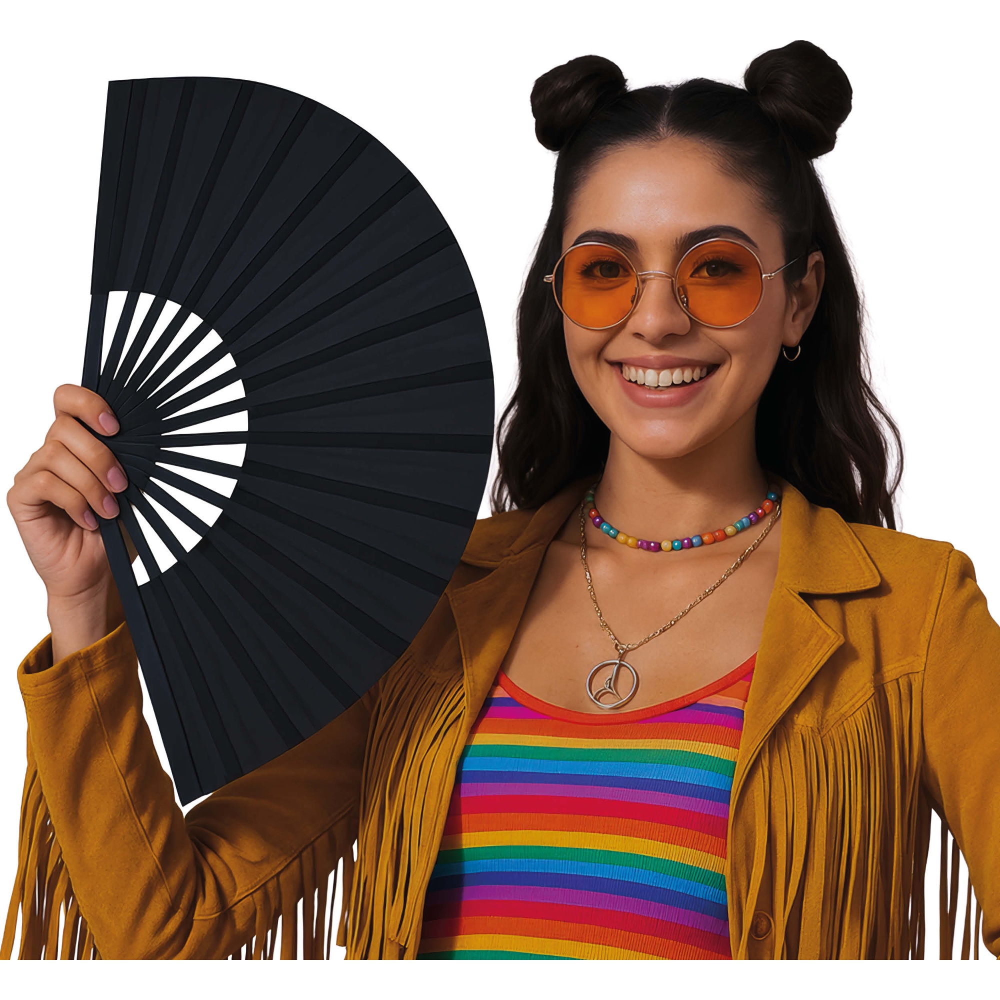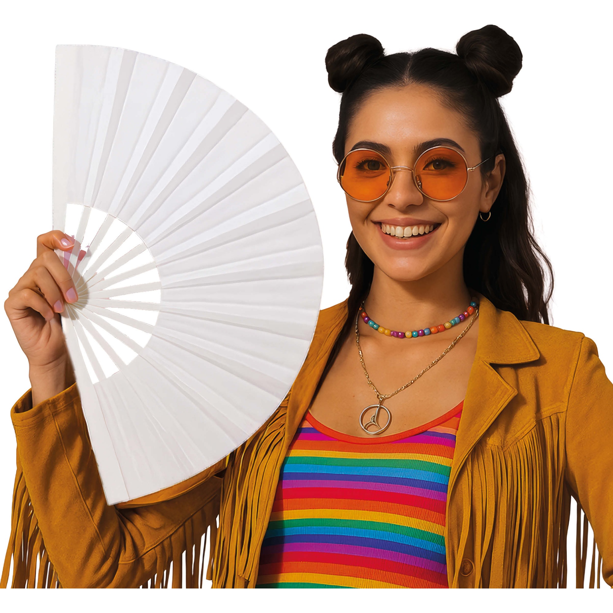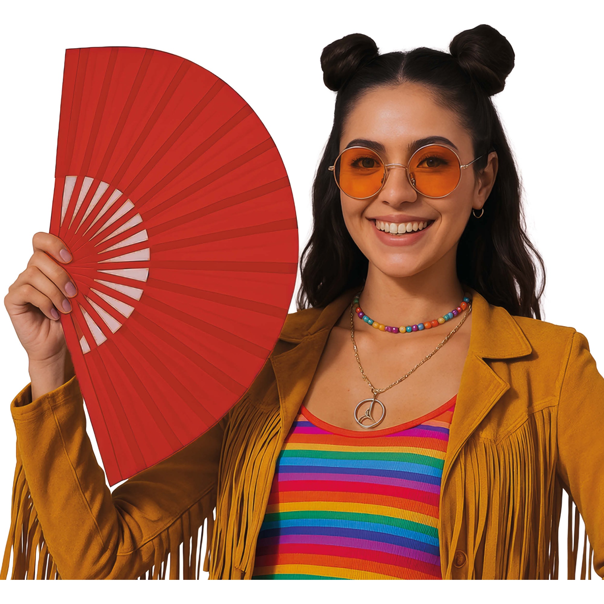Abanico de tela plegable 60x30 cm. Ligero y fácil de manejar, aporta un toque elegante y festivo a cualquier look o ambientación. Su formato plegable facilita su transporte y almacenamiento. Perfecto para completar disfraces, animar fiestas y destacar en sesiones de fotos y actuaciones.