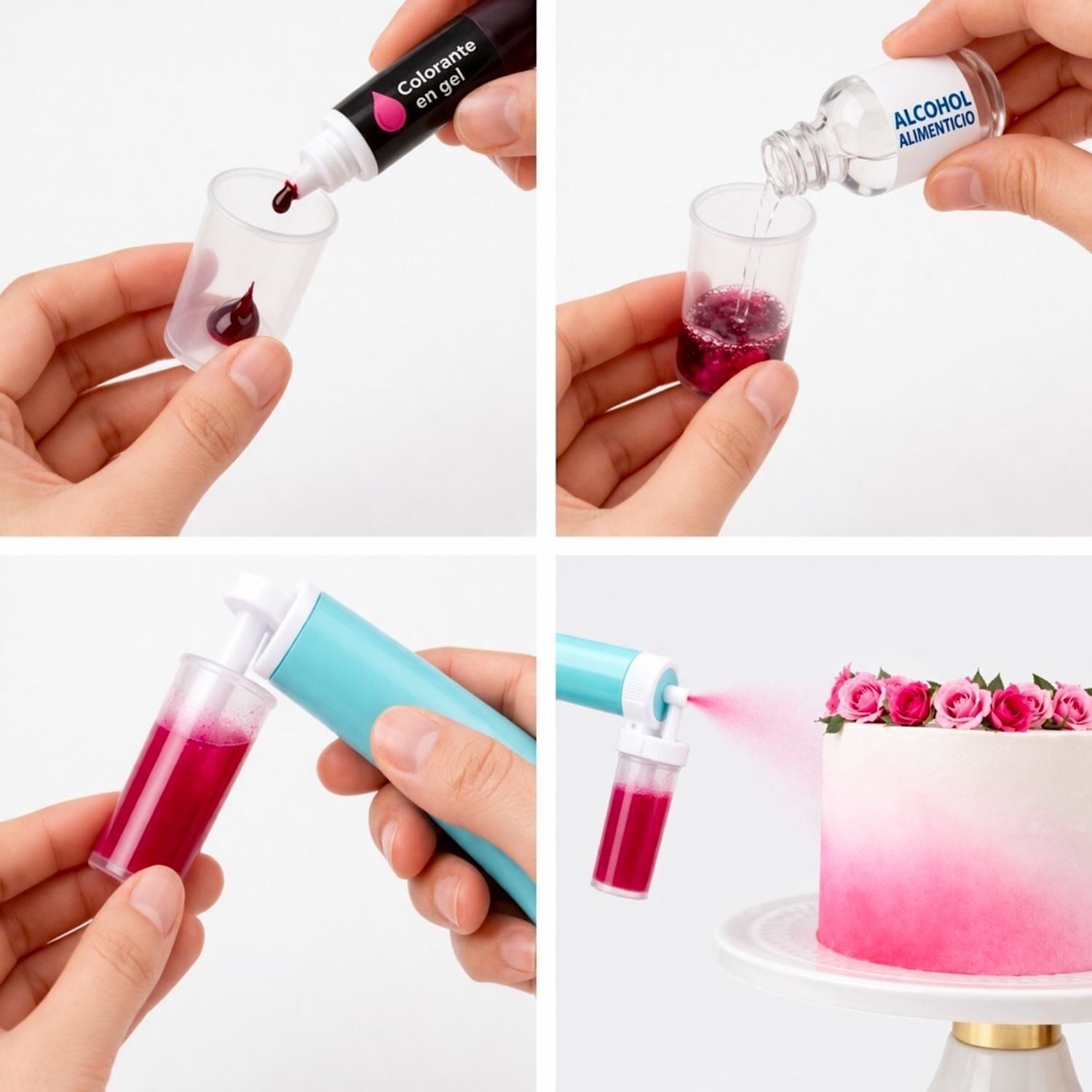- Si utilizamos colorantes en gel o en pasta, debe de ser disuelto en alcohol comestible para usarlo en el aerógrafo.