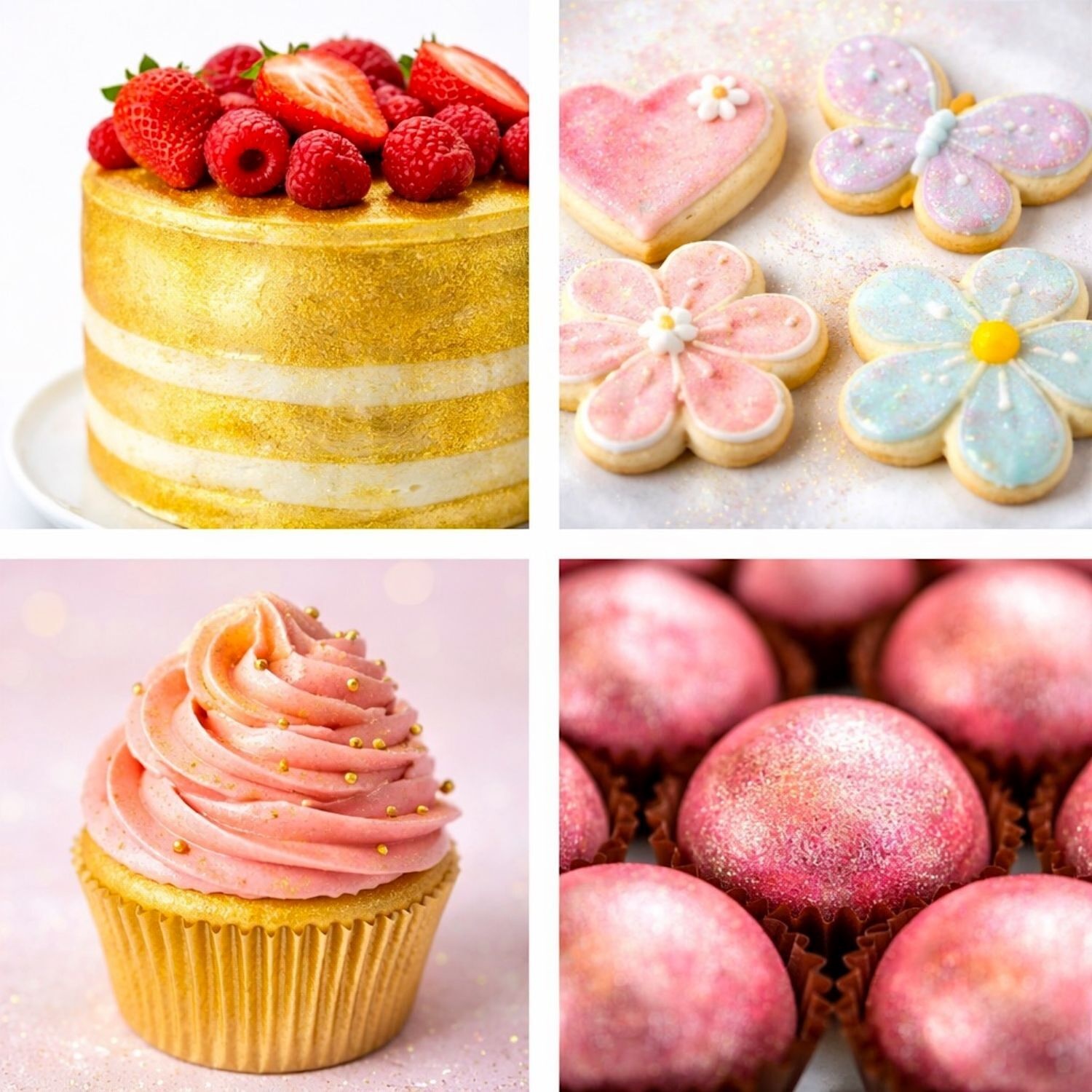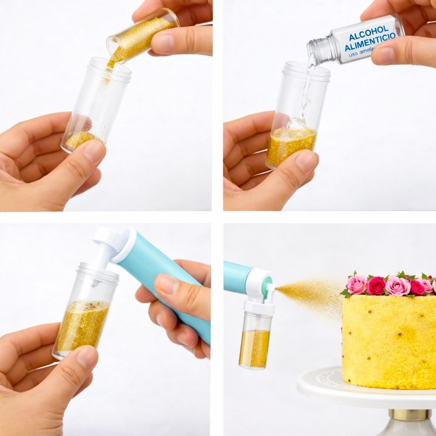 - En caso de tratarse de colorantes en polvo o purpurinas, podemos usar el producto directamente en seco (debe tratarse de pequeñas partículas para que puedan salir fácilmente a través del orificio del aerógrafo). También podemos diluir el polvo en alcohol alimenticio.