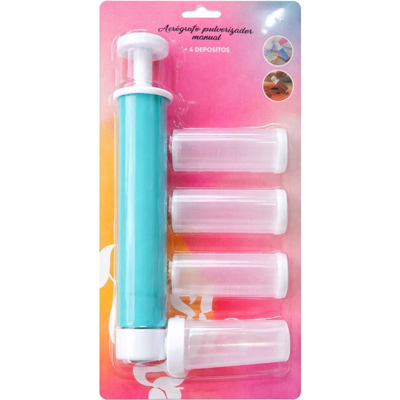 Aerógrafo manual con pulverizador de bomba, junto con 4 depósitos con tapadera, diseñado para aplicar color y brillo de manera rápida y efectiva a nuestras creaciones.