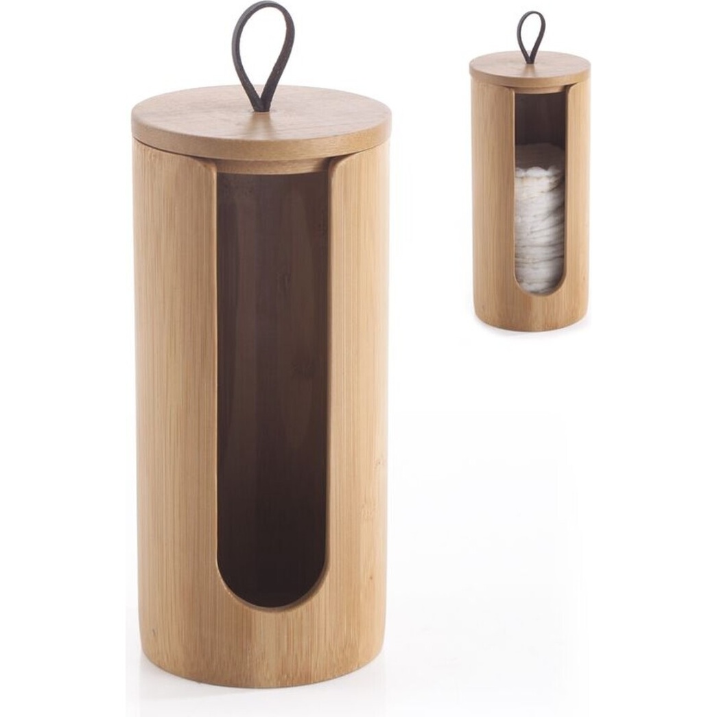 Algodonera elegante y funcional pensada para mantener tus algodones desmaquillantes siempre a mano. Diseño vertical con abertura frontal y tapa con asa que facilita el acceso y aporta un toque decorativo al baño o tocador. Acabado natural que combina con estilos modernos y rústicos, ideal para organizar tu rutina de belleza.