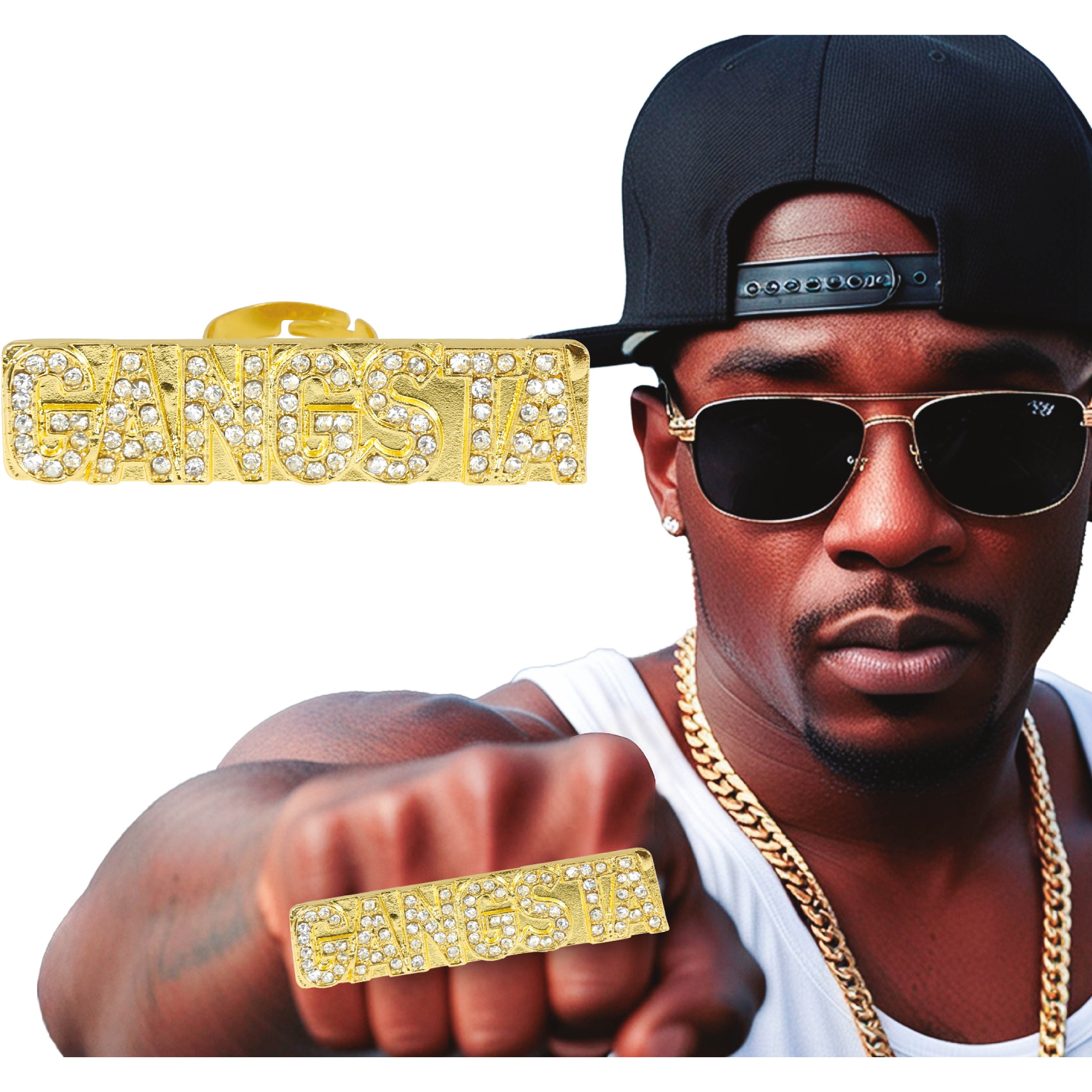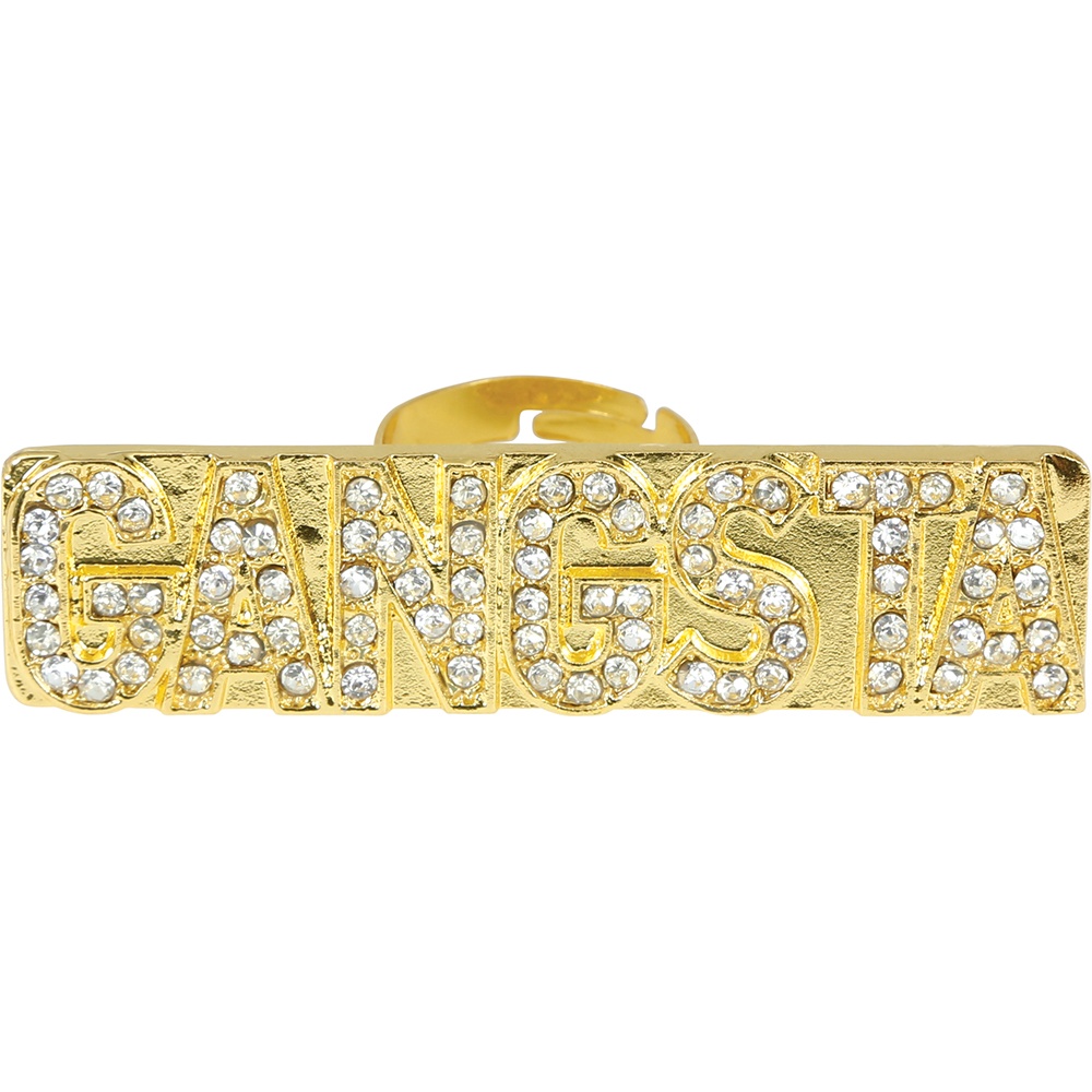 Anillo Gangsta es un accesorio llamativo que aporta el auténtico look hip hop y el acabado bling a tu estilo. Su diseño rectangular con la palabra "GANGSTA" cubierta de pedrería brillante y acabado dorado ofrece un impacto visual inmediato. Es un anillo metálico pensado para destacar en fotos y outfits urbanos. Ligero y fácil de poner, añade personalidad y actitud a cualquier conjunto.
