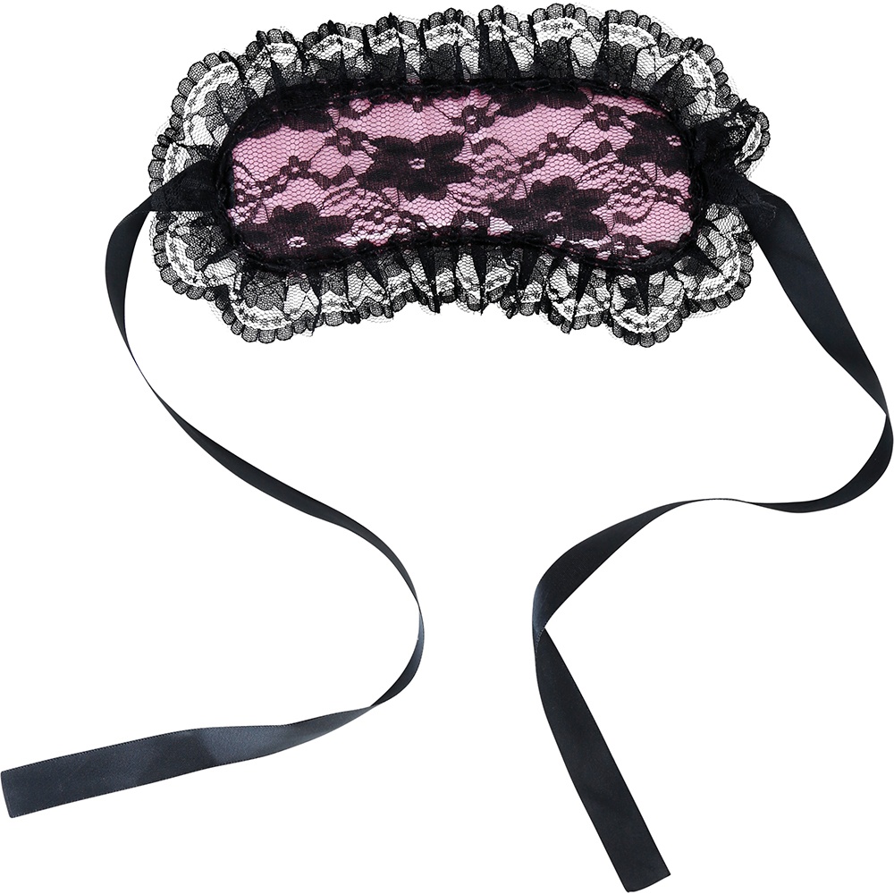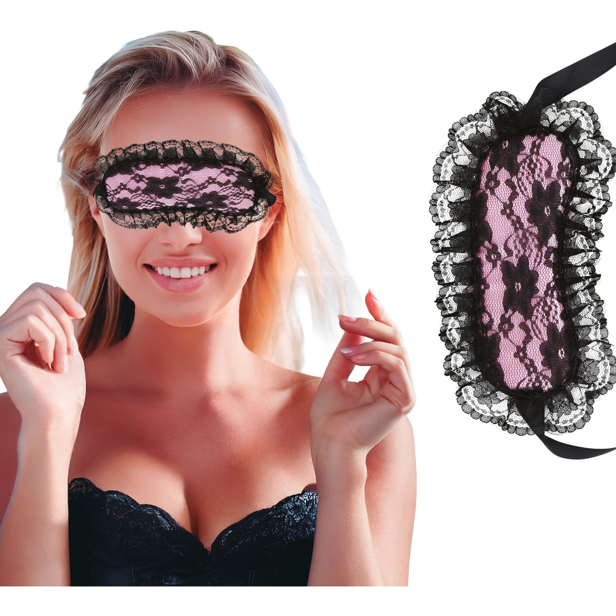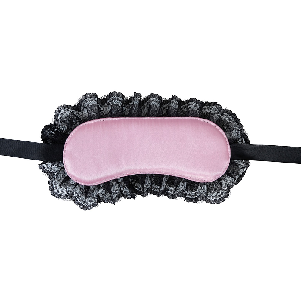 Antifaz sensual rosa con elegante blonda negra que realza la mirada y añade un toque seductor a tus momentos íntimos.