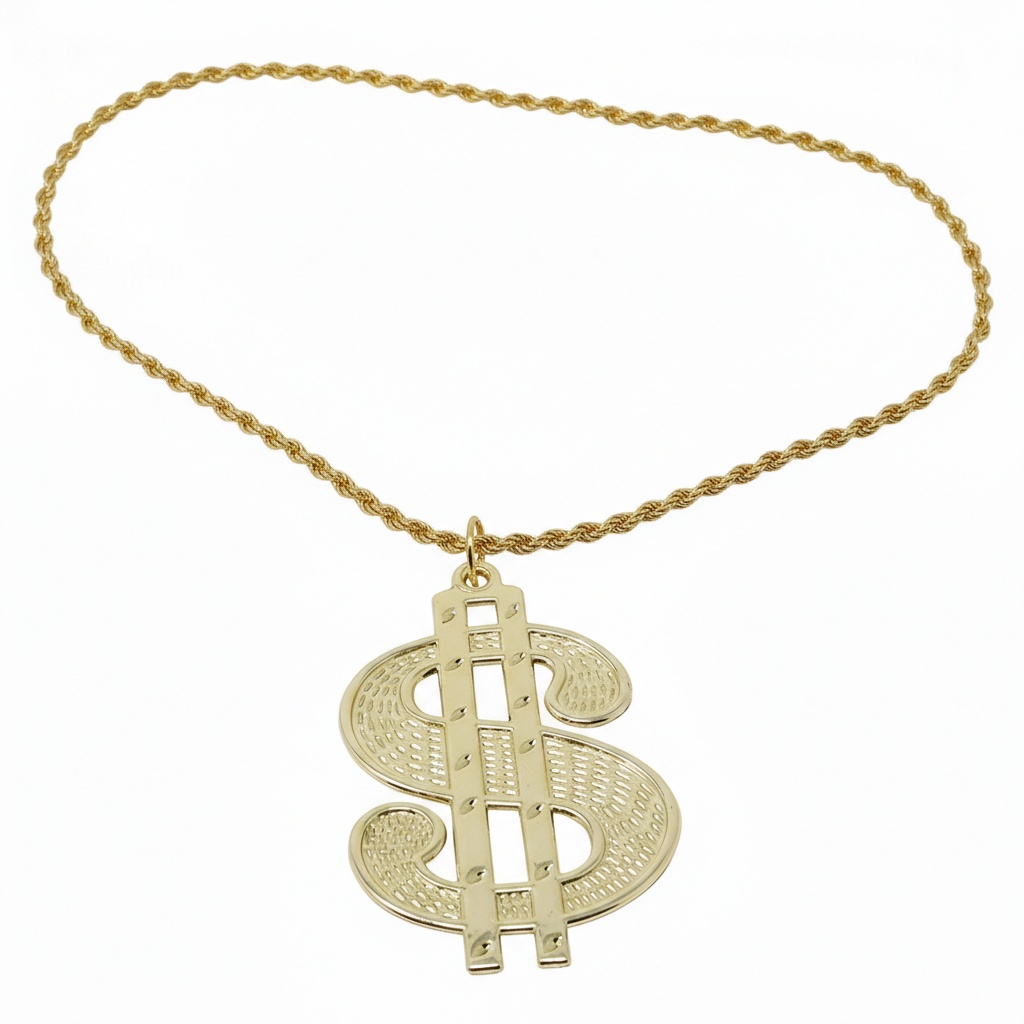 Collar de bisutería de color dorado que consiste en una cadena de eslabones con el símbolo del dólar colgando de él.