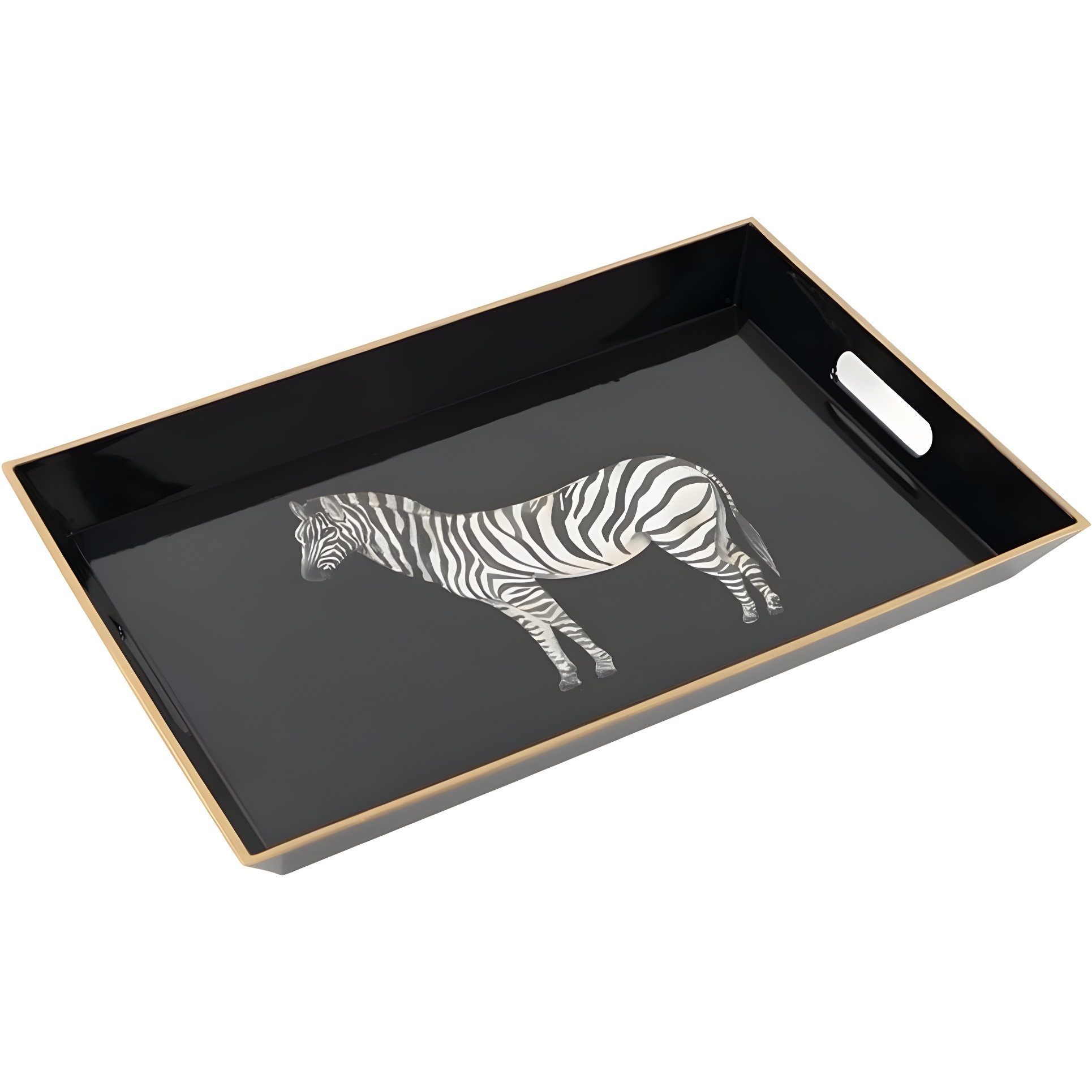 Elegante bandeja decorativa en negro con ilustración de cebra y borde dorado que aporta un toque sofisticado al hogar.