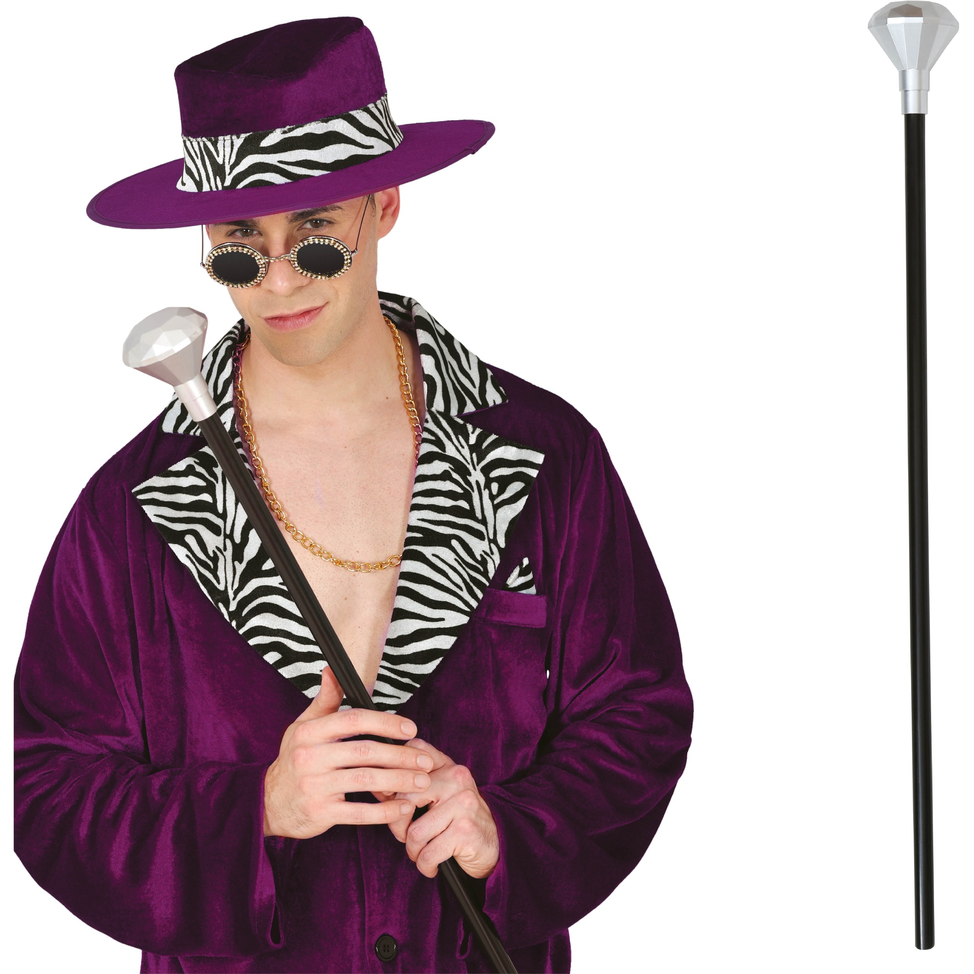 Accesorio llamativo inspirado en el estilo Willy Wonka para completar tu disfraz con un toque de glamour. Perfecto para fiestas temáticas, Carnaval y sesiones fotográficas. Fabricado en PVC ligero y con un pomo efecto diamante plateado que capta la atención. Diseño elegante de fácil manejo que aporta presencia y estilo a tu look.
