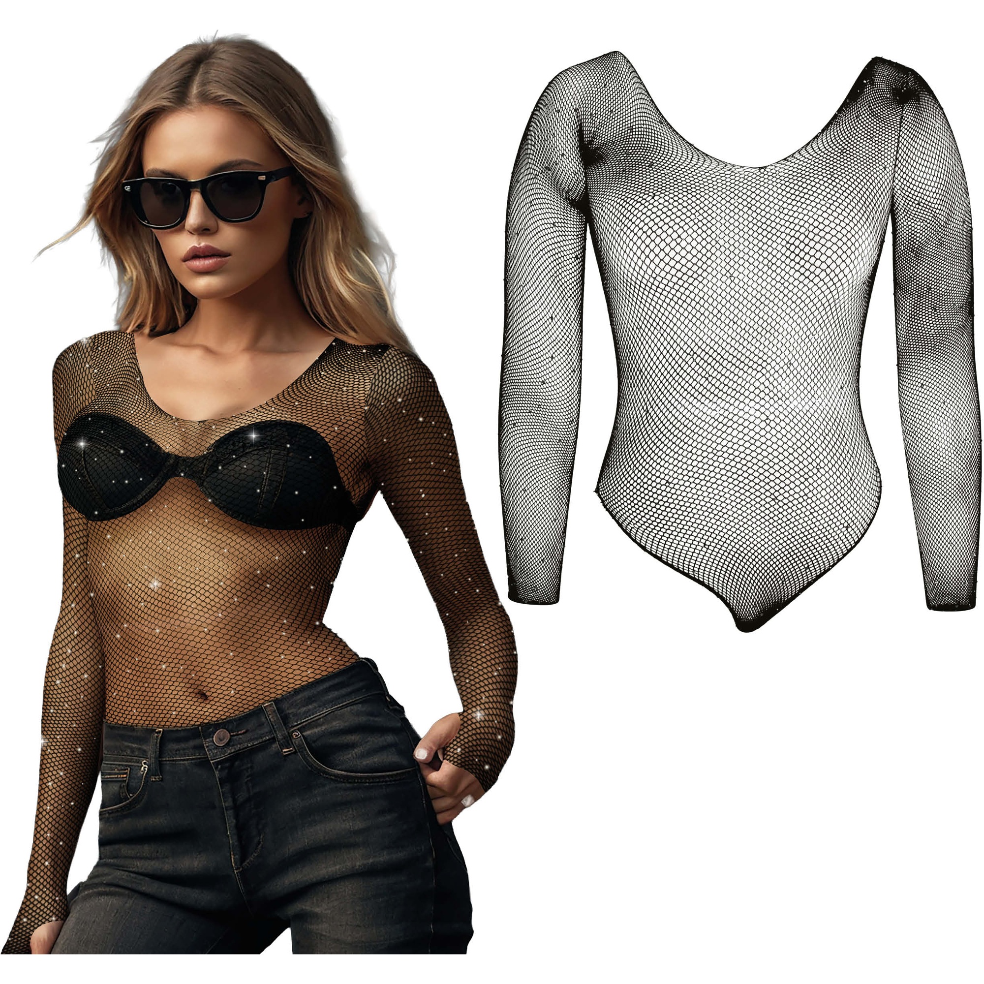 Body negro de malla con pedrería brillante pensado para looks de noche y ambiente de club. Su corte entallado y mangas largas ofrecen una silueta sofisticada y sensual, con transparencia controlada que realza cualquier conjunto. Perfecto para combinar con bralette, jeans, faldas o shorts y crear estilos atrevidos y modernos. Confeccionado en elastano y poliamida para un ajuste cómodo y flexible que se adapta al cuerpo.
