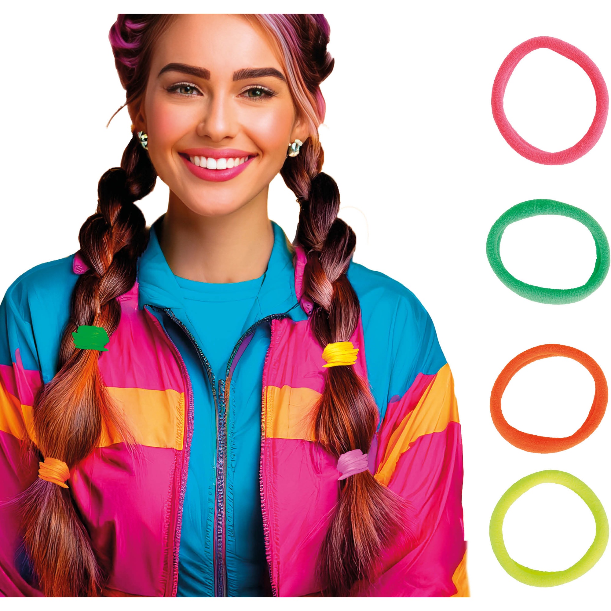 Pack de gomas de pelo neón pensado para dar un toque retro y divertido a tus peinados.