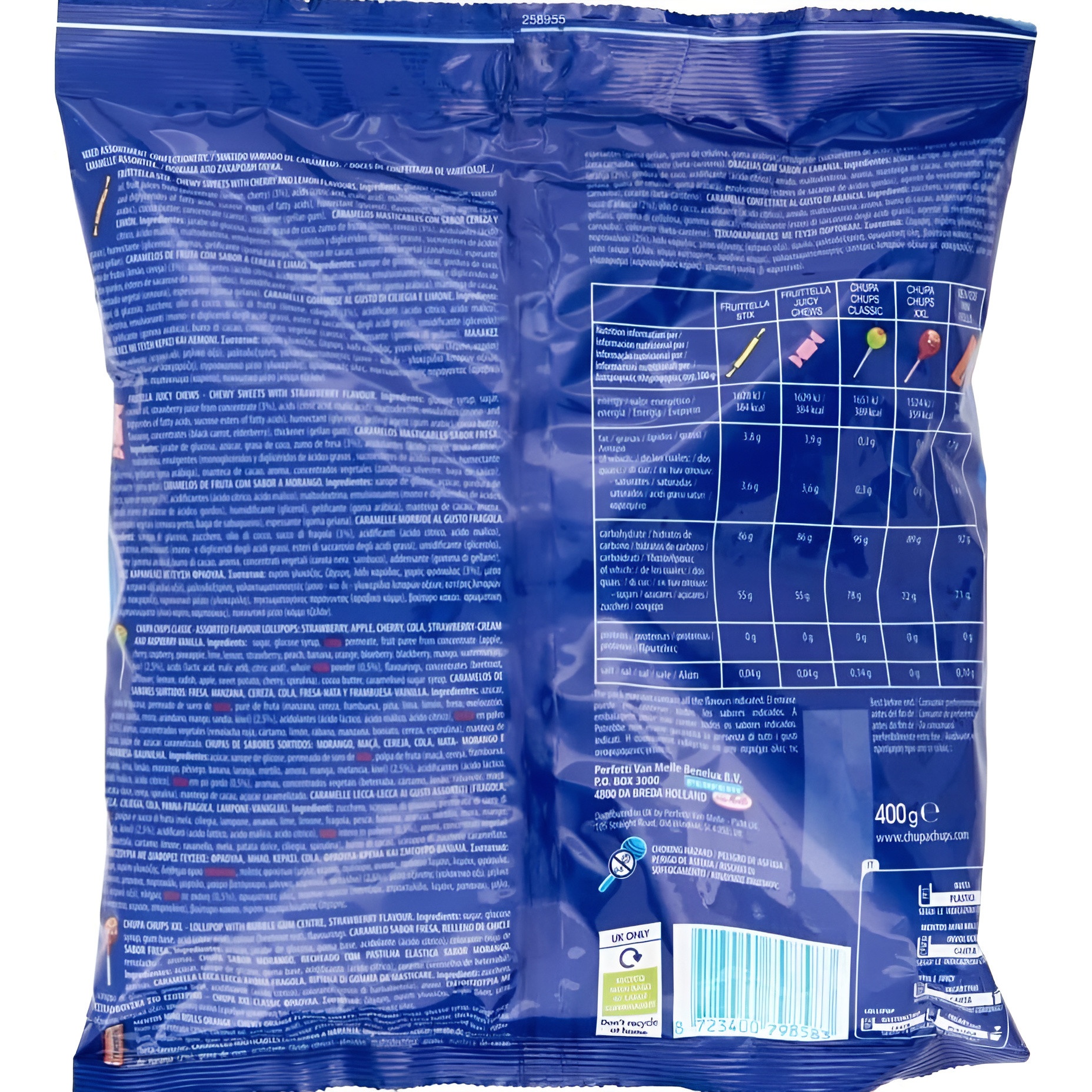 - Incluye: caramelos masticables con sabor cereza y limón (Fruittella Stix), caramelos masticables sabor fresa (Fruittella Juicy Chews), chupachups de sabores surtidos (Chupa Chups Classic), chupachups relleno de chicle sabor fresa (Chupa Chups chicle), mentos sabor naranja (Mentos Mini Rolls Orange).