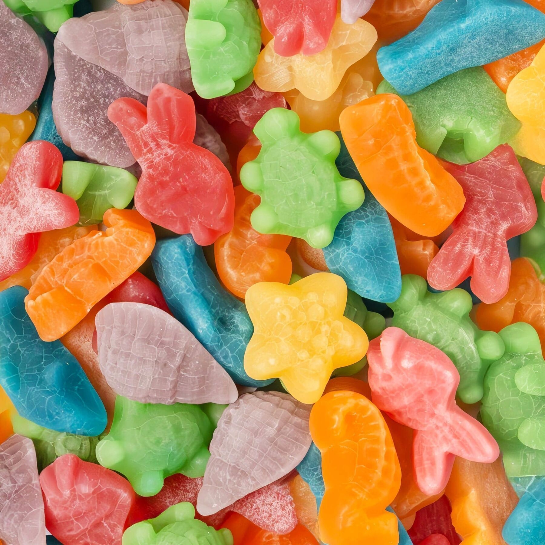 - Gominolas con forma de estrellas, caracolas, peces, tortugas y delfines