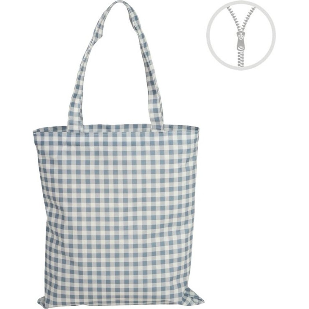 Bolsa con diseño vichy en tonos azules que combina estilo clásico y funcionalidad moderna. Cuenta con cierre de cremallera para mantener el contenido protegido y un tejido impermeable que evita la entrada de agua. Sus asas largas facilitan llevarla al hombro y su tamaño amplio permite transportar toallas, accesorios y más con comodidad.