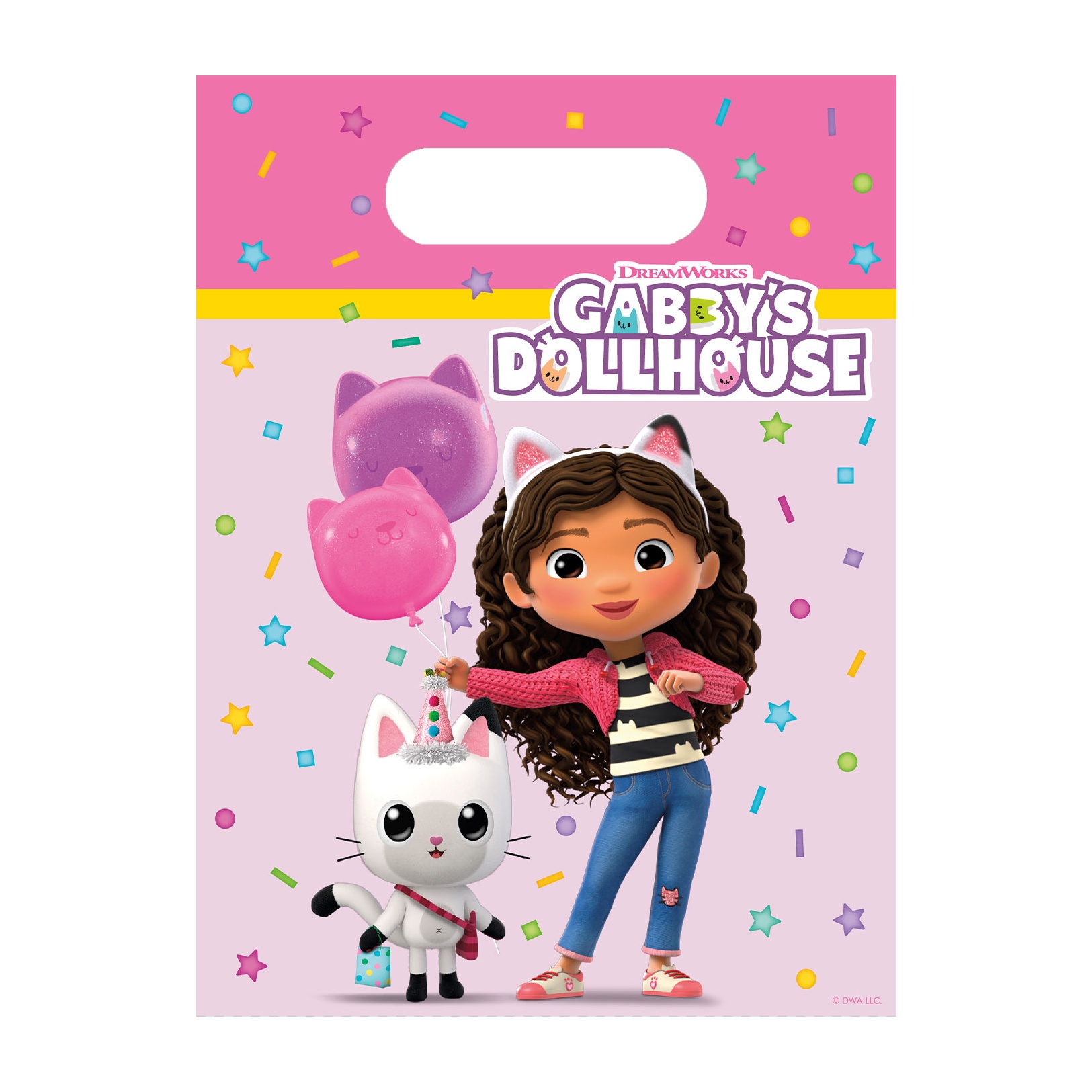 Bolsas de fiesta con diseño inspirado en Gabby's Dollhouse, perfectas para dar un toque divertido y colorido a cualquier celebración infantil. Presentan ilustraciones de personajes y confeti en tonos alegres que encantarán a los más pequeños. Cuentan con asas troqueladas para un transporte cómodo y un formato ligero pensado para facilitar la preparación de bolsitas de regalo y recuerdos de fiesta.