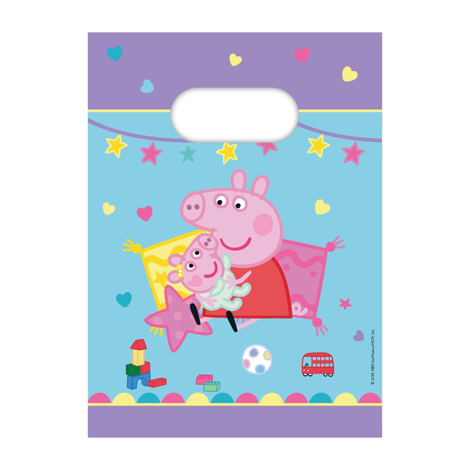 Pack de 4 bolsas regalo con el divertido diseño de Peppa Pig, pensadas para añadir un toque alegre a las fiestas infantiles. Colores vivos y motivos cariñosos que encantarán a los más pequeños. Asa troquelada para transportarlas con facilidad y apertura amplia para introducir chuches y pequeños detalles.