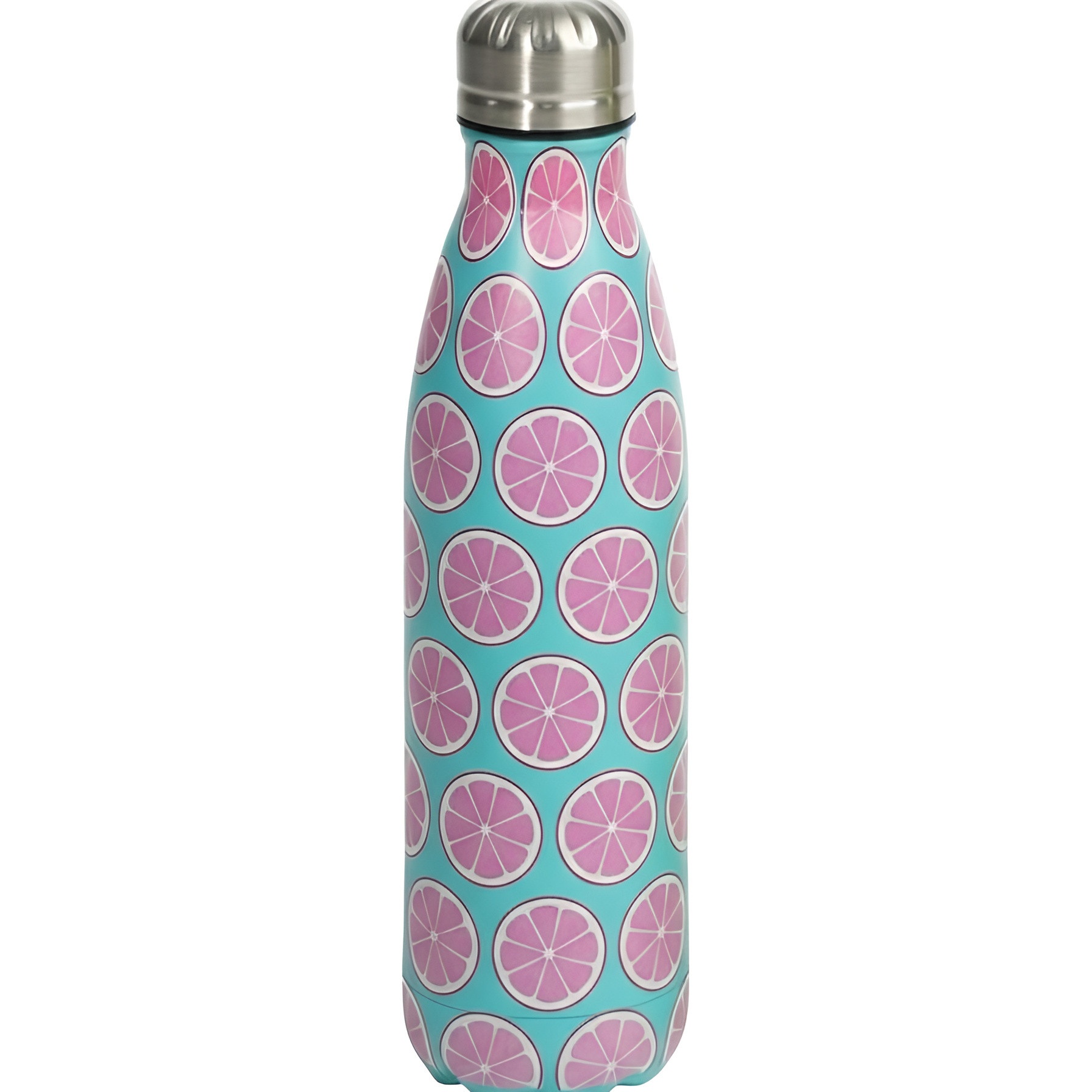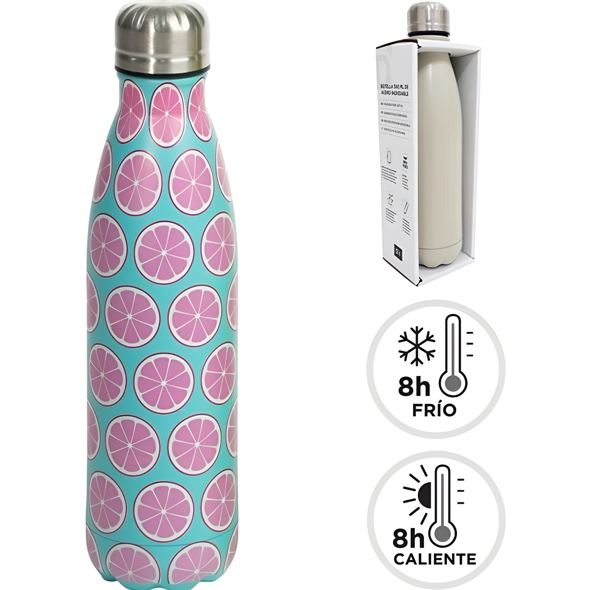 Botella isotérmica con un alegre estampado de frutas, perfecta para llevar tus bebidas favoritas con estilo. Diseño moderno y colorido que aporta un toque divertido a tu día a día. Ligera y cómoda de transportar, ideal para la oficina, el gimnasio o salidas al aire libre.