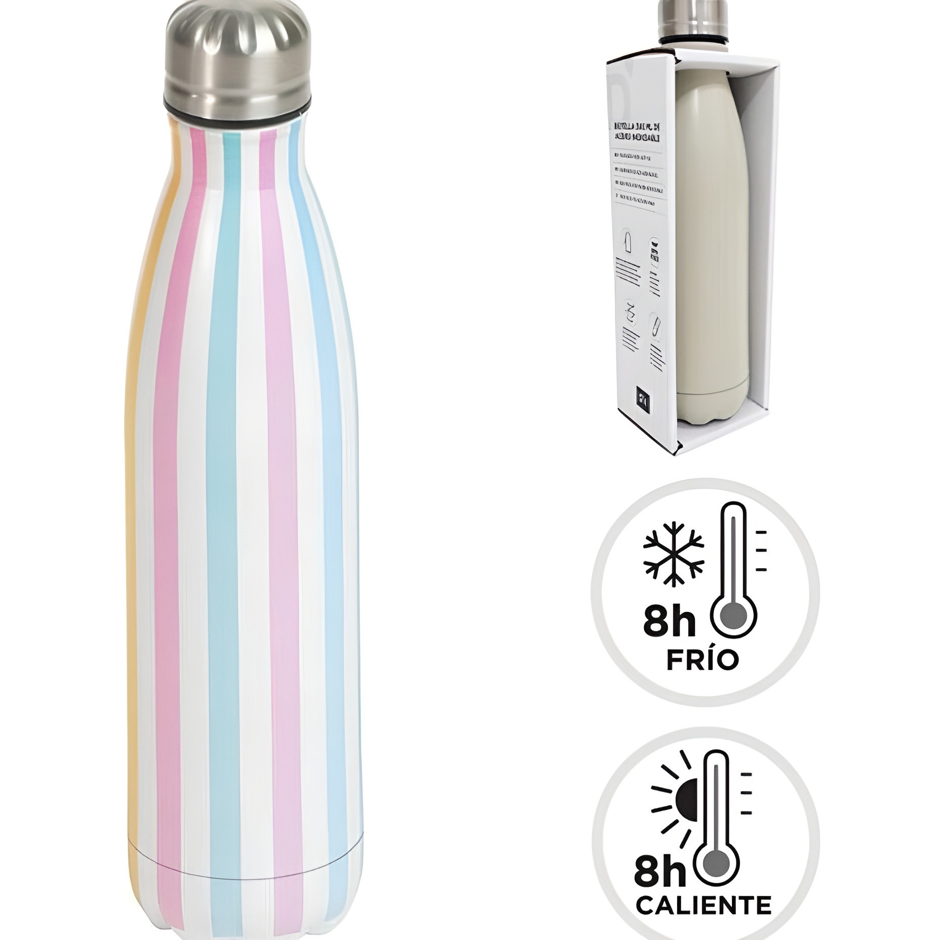 Botella térmica con un alegre diseño de rayas en tonos pastel que aporta color y estilo a tu día a día.
