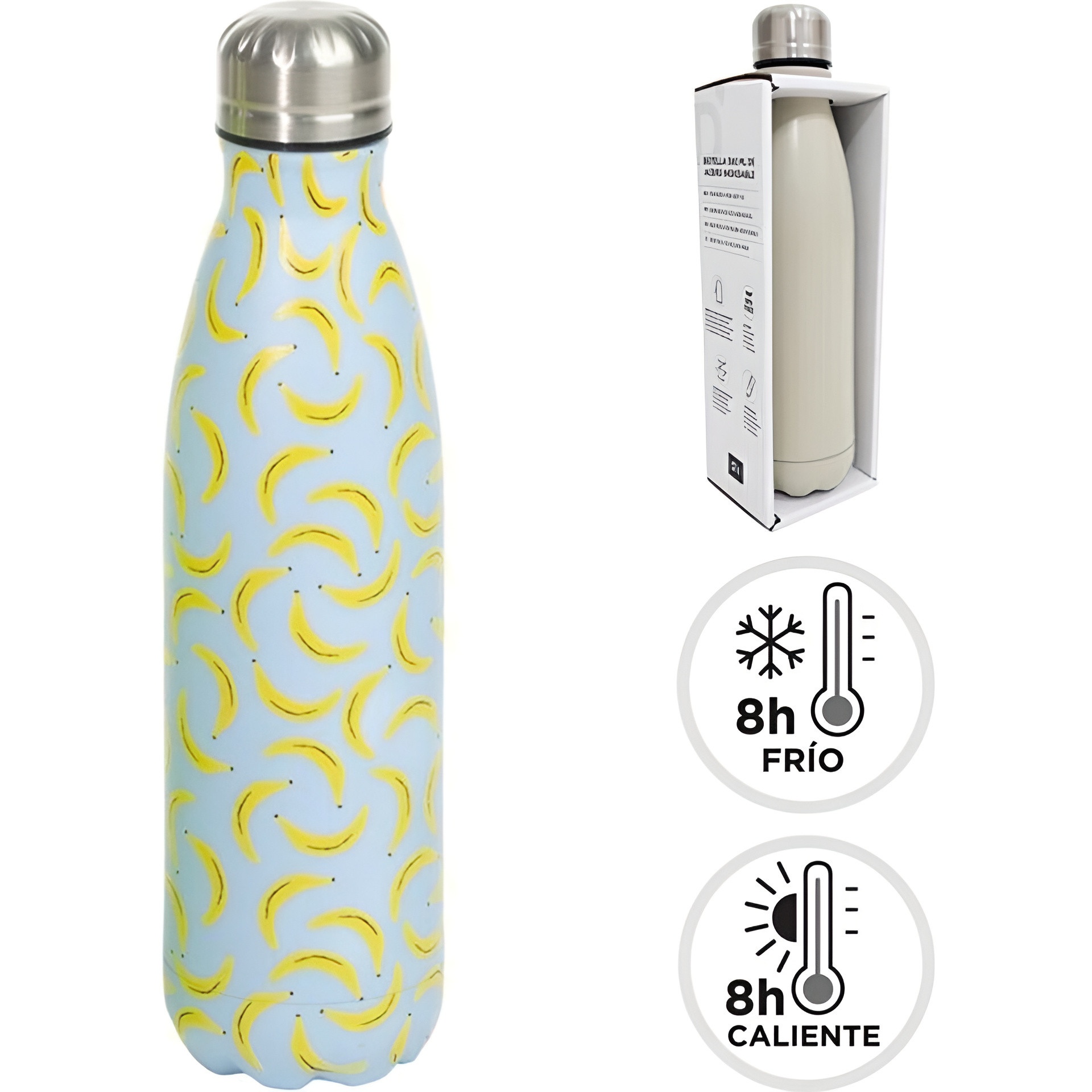Botella termo de doble capa pensada para mantener tus bebidas a la temperatura ideal durante más tiempo. Su acabado con estampado de plátanos le da un toque alegre y veraniego que destaca donde la lleves. Diseño ergonómico y cierre seguro para evitar derrames y facilitar su transporte. Perfecta para el día a día, el trabajo, el deporte o escapadas al aire libre.