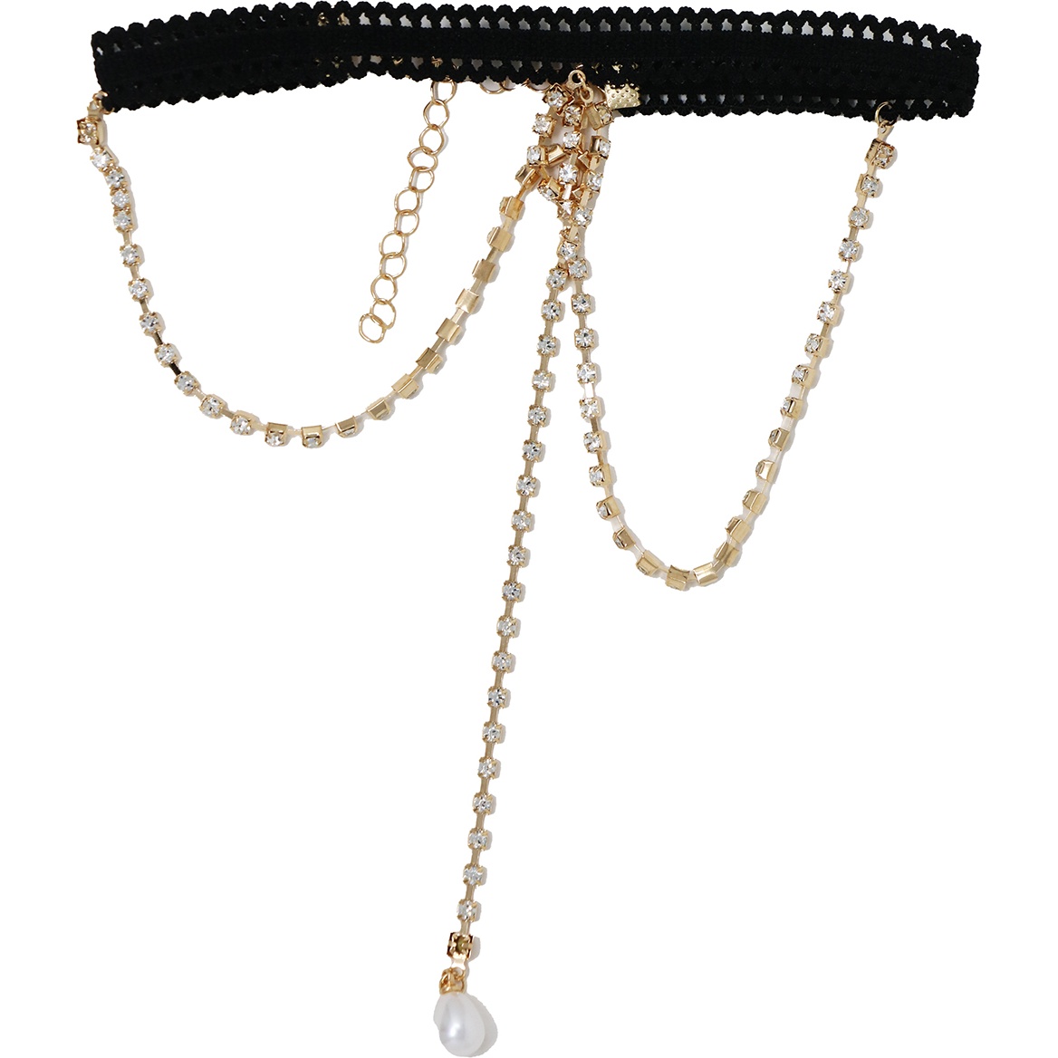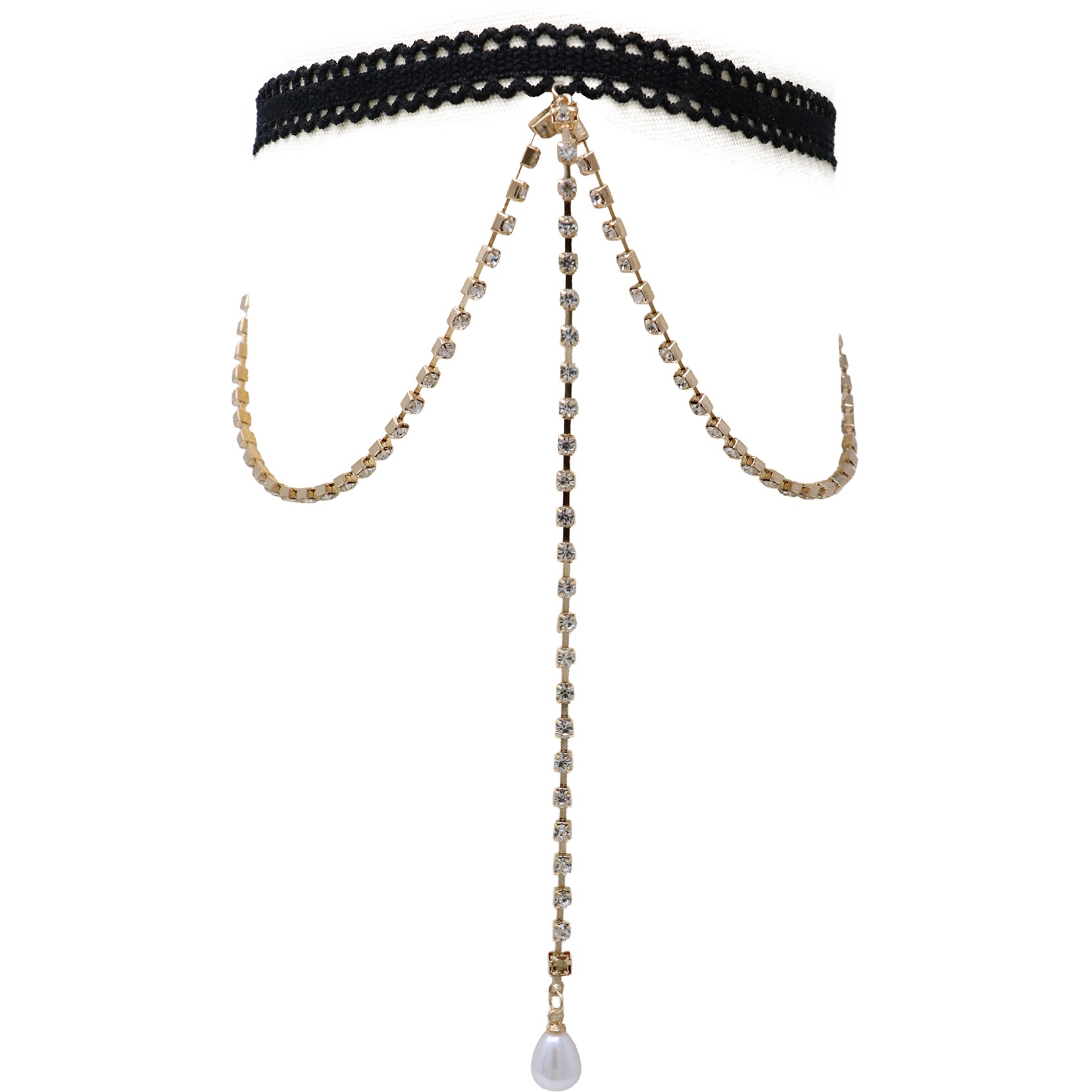Cuenta con una cinta de encaje negra y cadenas decoradas con brillantes de imitación y colgante tipo perla para un acabado sofisticado.