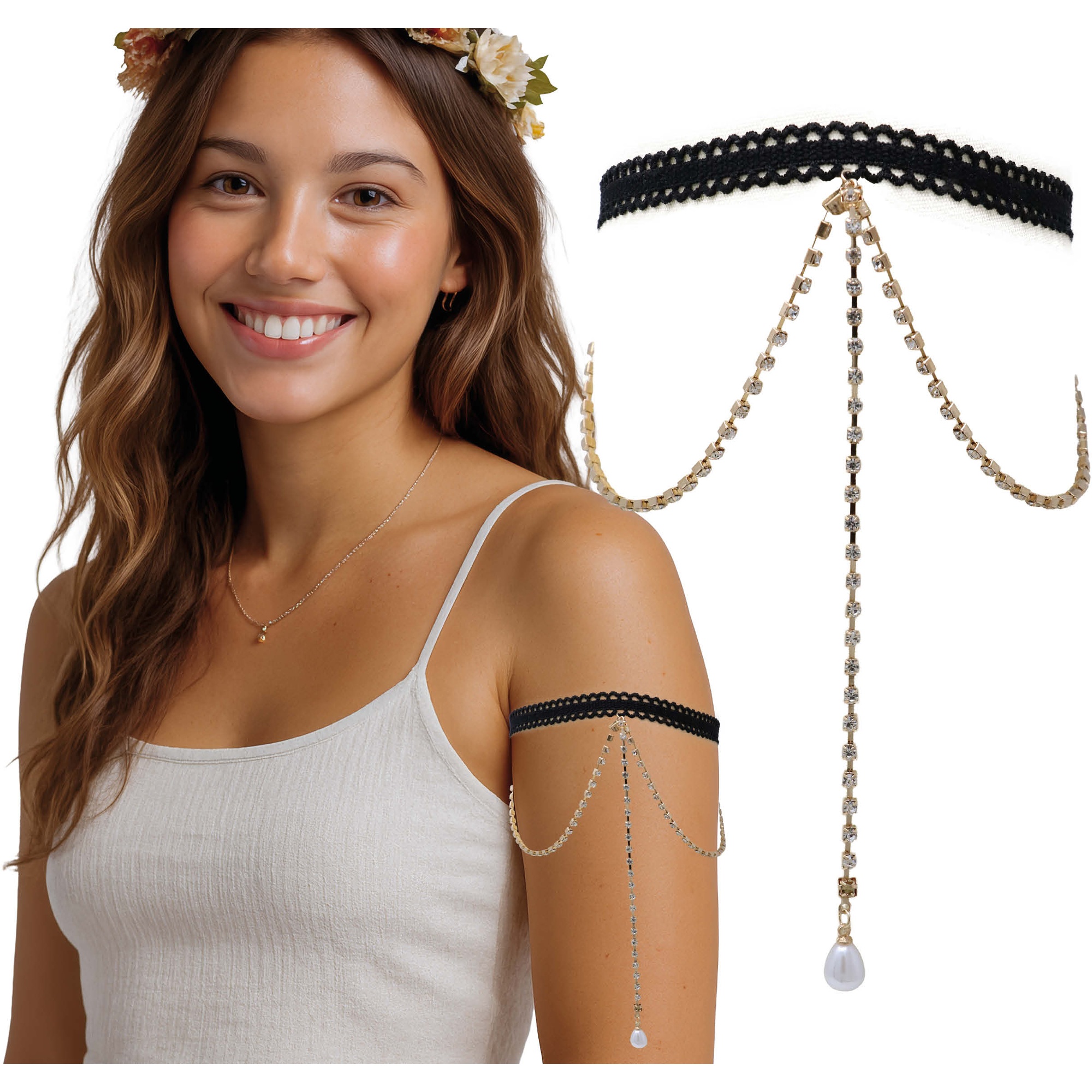 - Estilo boho-chic: encaje negro y cadenas drapeadas que realzan el brazo con un toque romántico.