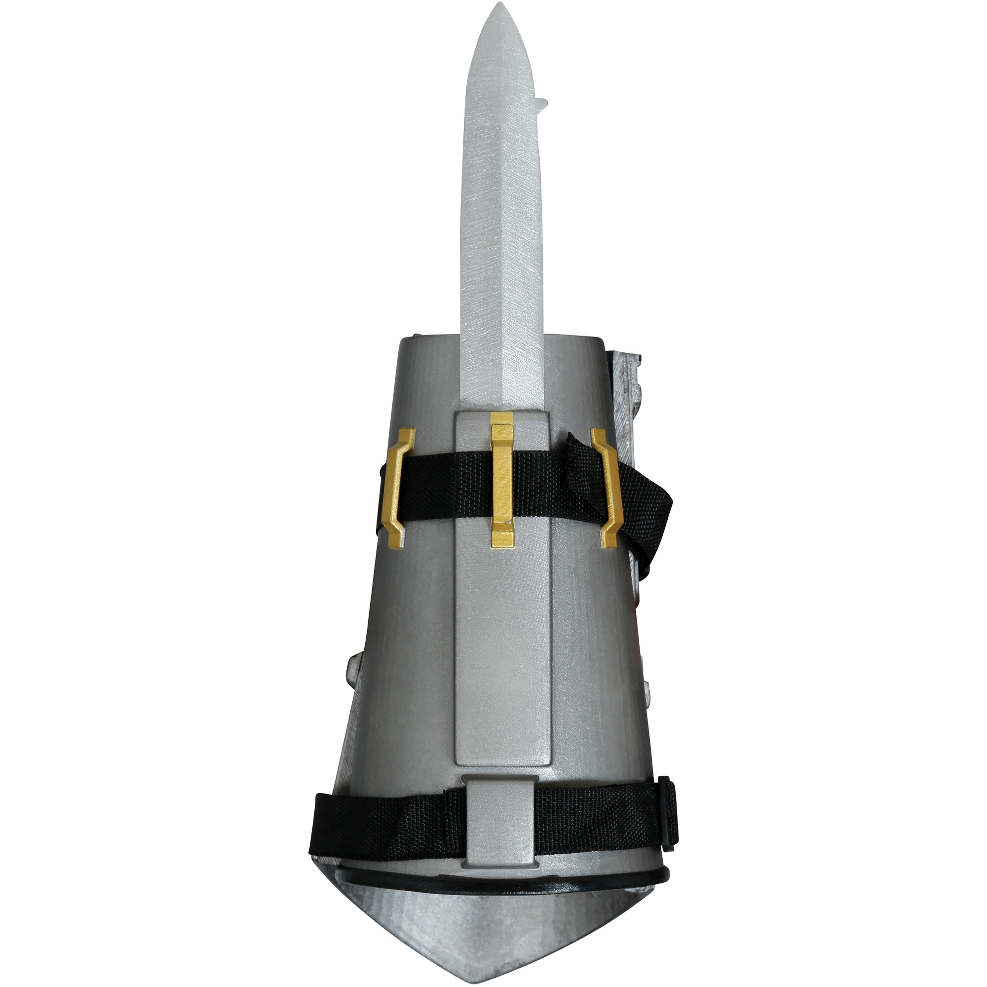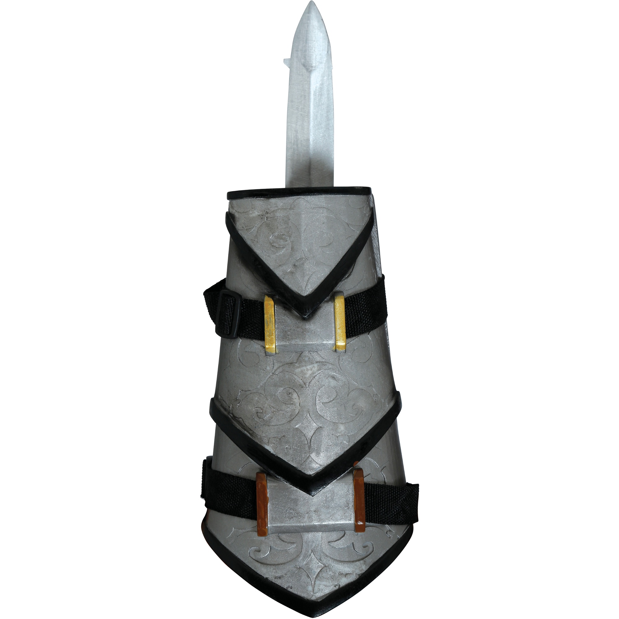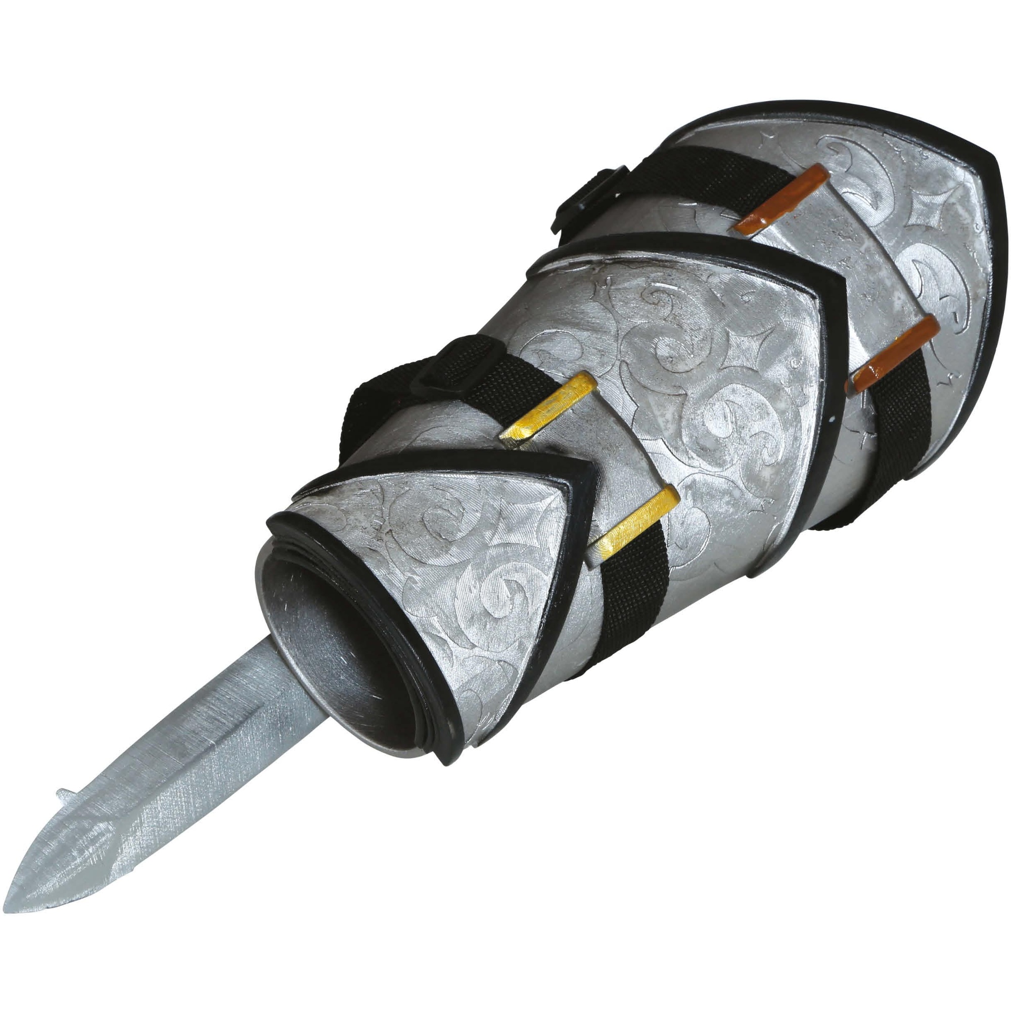 Brazalete con puñal retráctil pensado para cosplay, recreaciones y sesiones de fotos. Presenta un acabado metálico envejecido y detalles ornamentales que aportan un aspecto realista sin ser peligroso. El mecanismo retráctil permite desplegar el puñal de forma rápida para poses y escenas. Correas ajustables con cierre de velcro para un ajuste cómodo y seguro en el antebrazo.