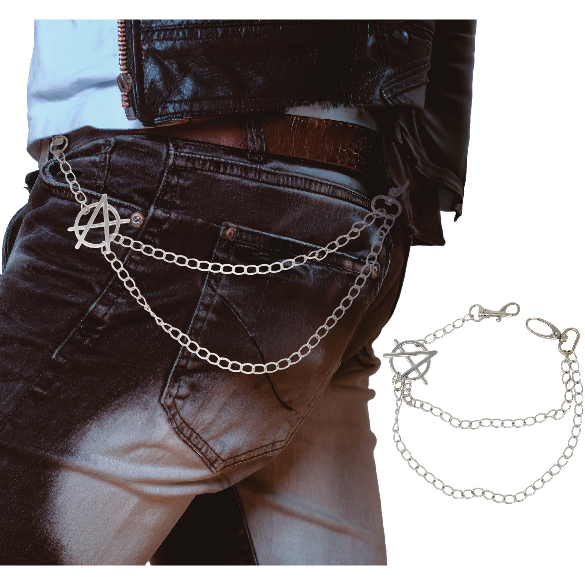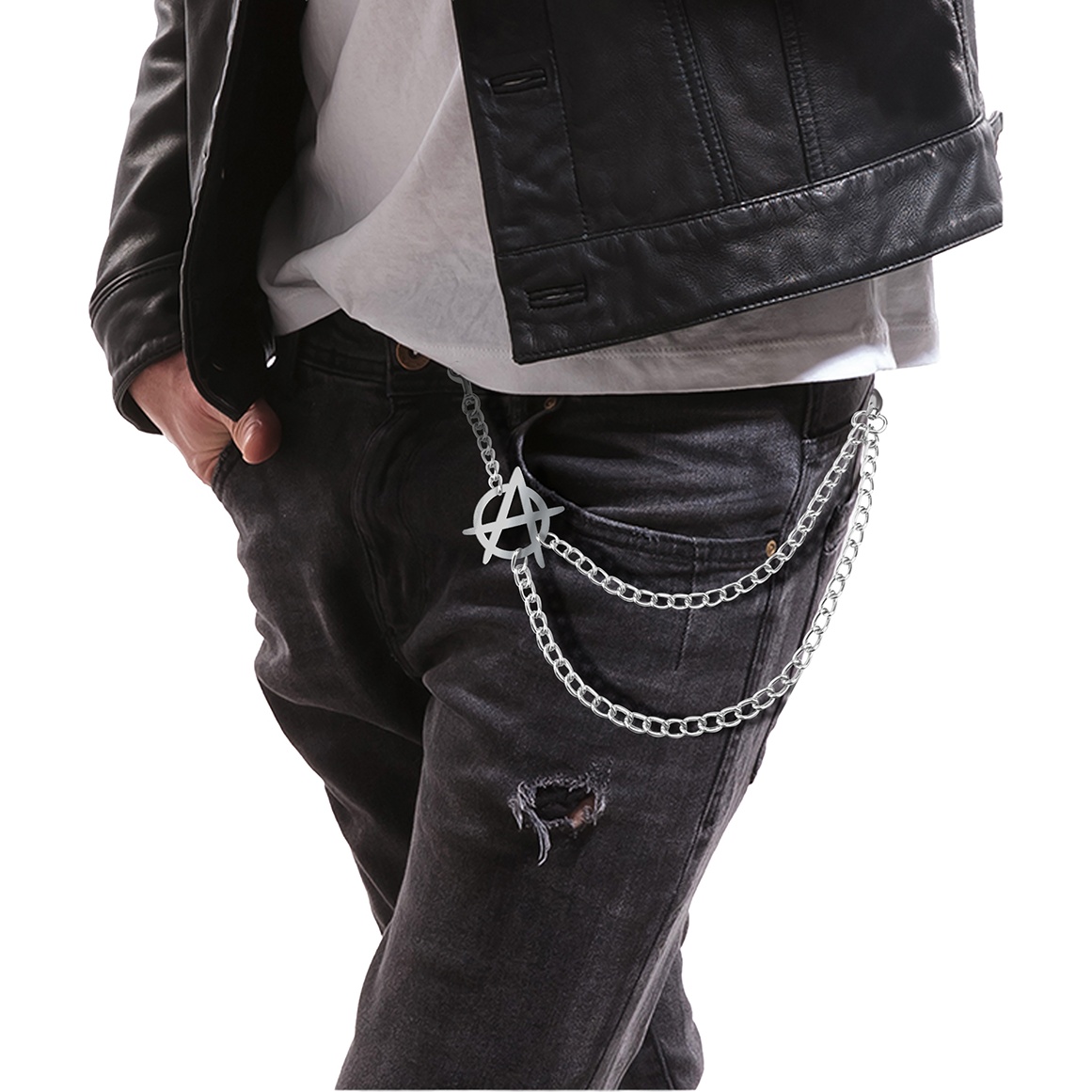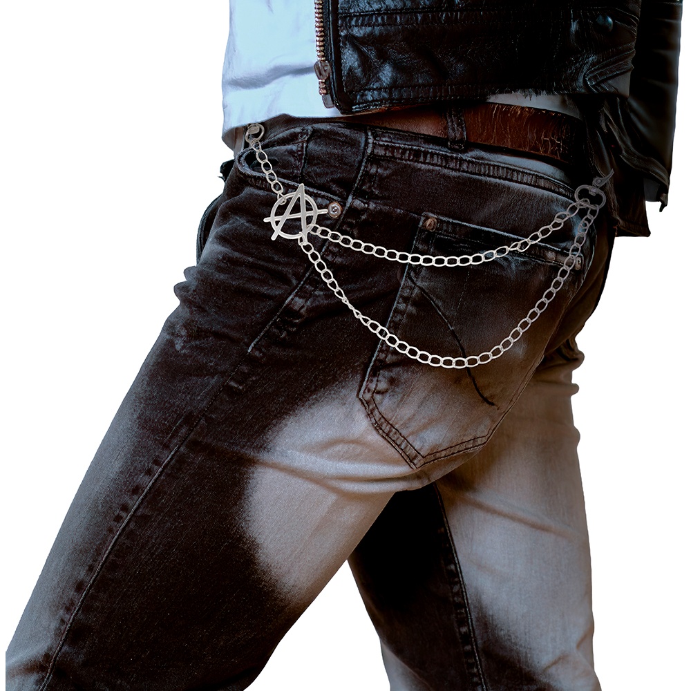 Accesorio de estilo punk diseñado para añadir un toque rebelde a tus looks con jeans. El colgante con el símbolo de anarquía y la composición de doble cadena crean un efecto llamativo y auténtico. Perfecta para conciertos, salidas nocturnas o para completar un outfit urbano con actitud. Diseño pensado para sujetarse fácilmente al cinturón o a las trabillas del pantalón.
