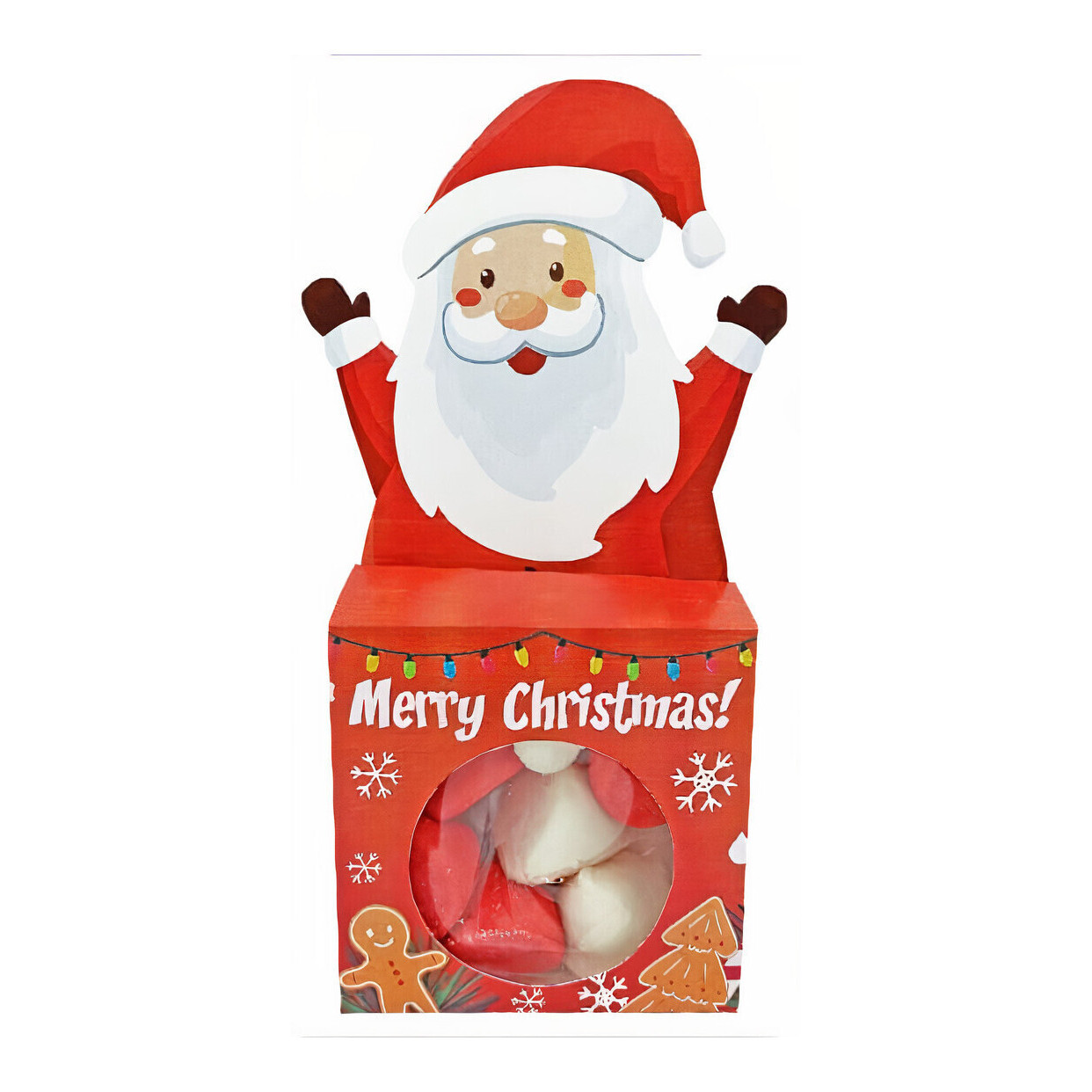 Silueta de cartón con la imagen de Papá Noel con una bolsita dentro con nubes rojas y blancas, ideal para regalar en Navidad.