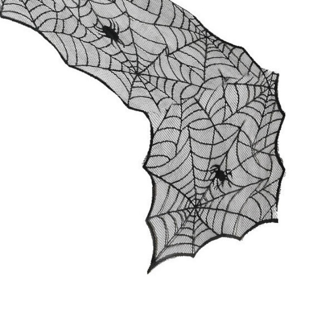 • Camino de mesa negro de encaje con dibujos de telarañas.