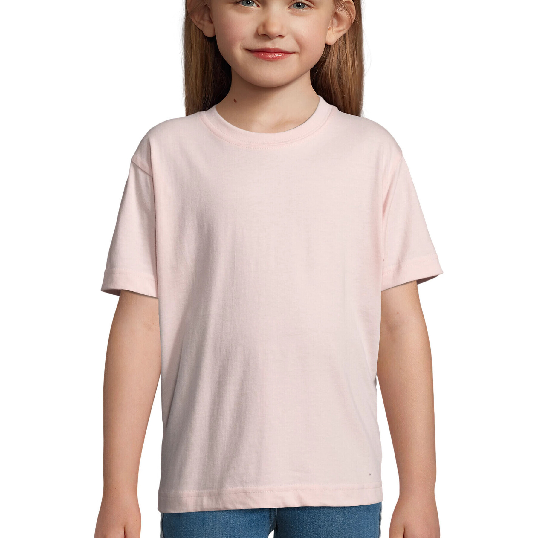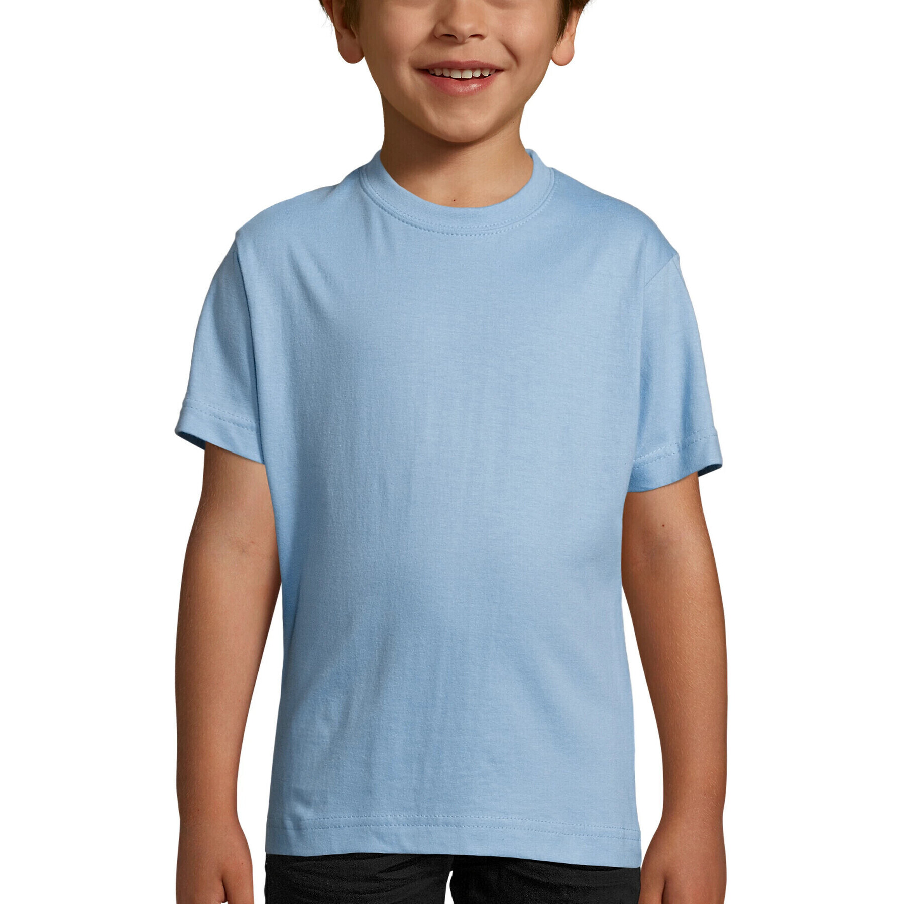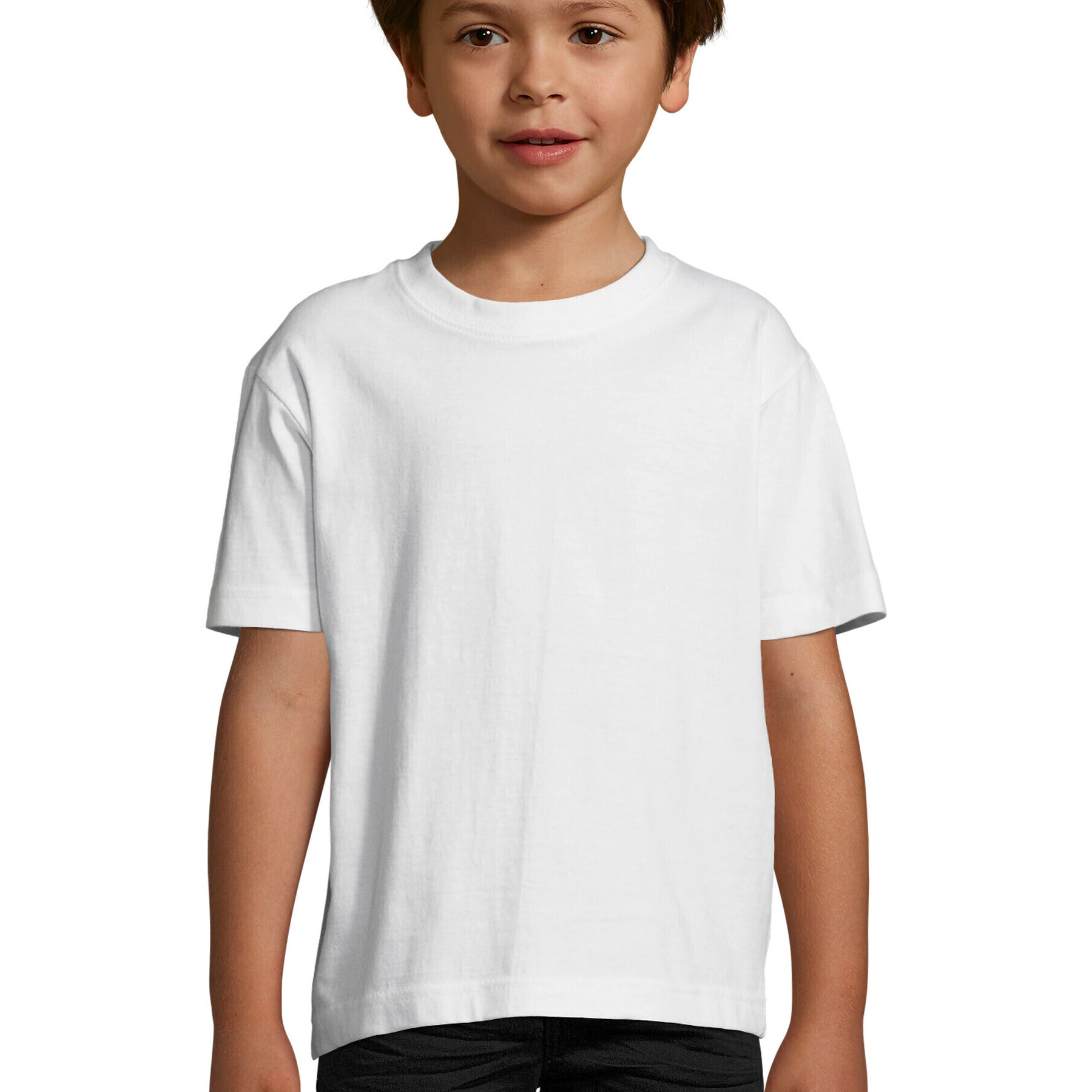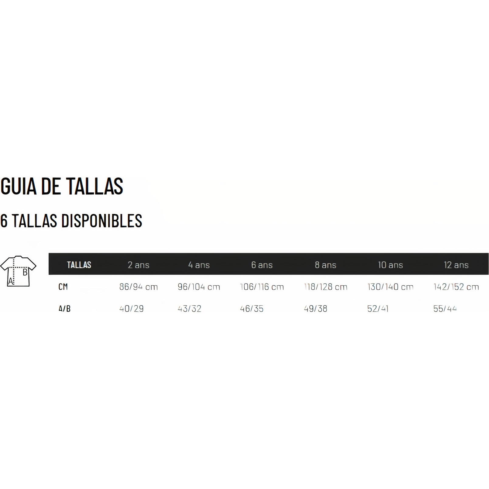 - Estilo: tapacosturas reforzado en el cuello; cuello de punto acanalado; manga corta; con costuras laterales (2-6 años) o tubular (a partir de 8 años).
