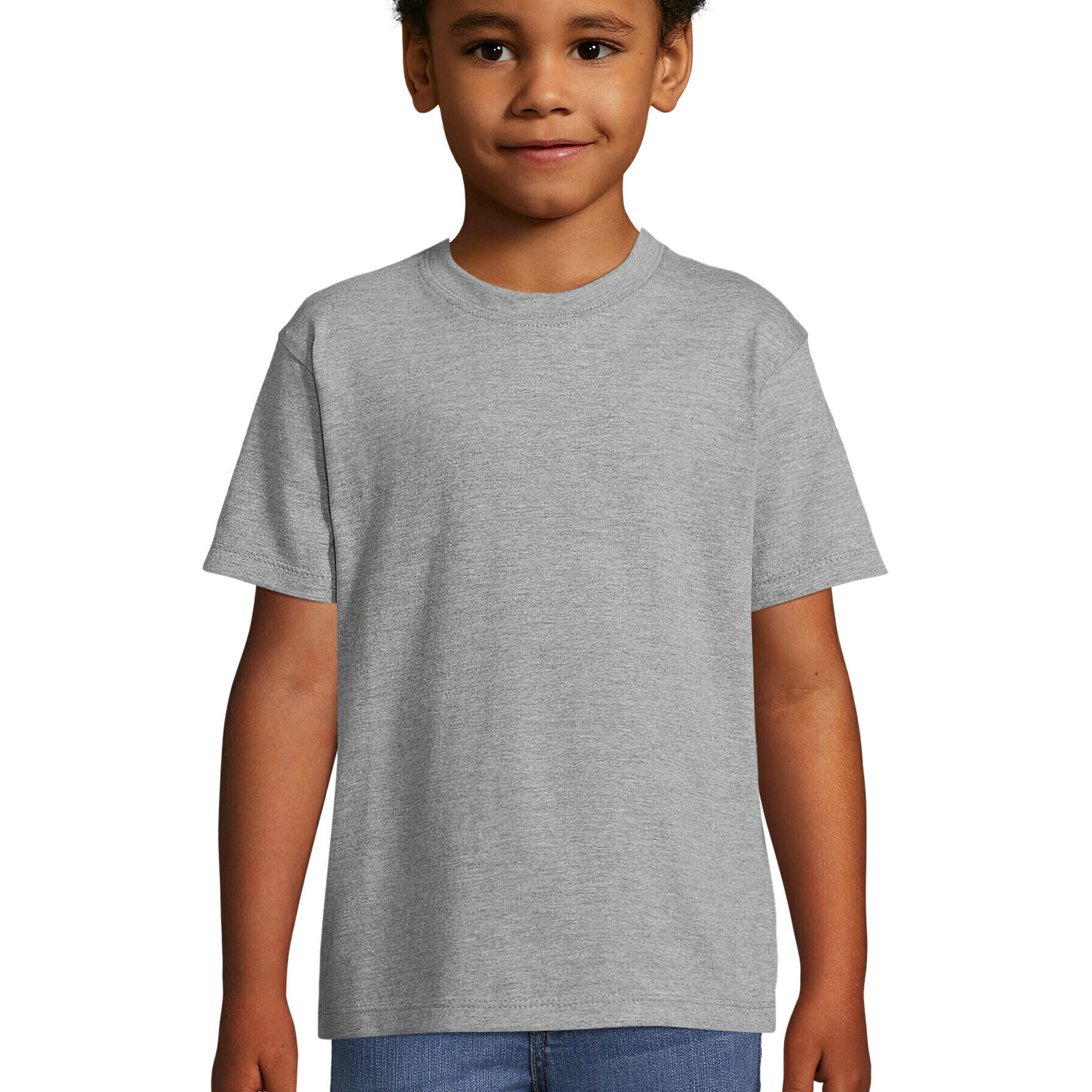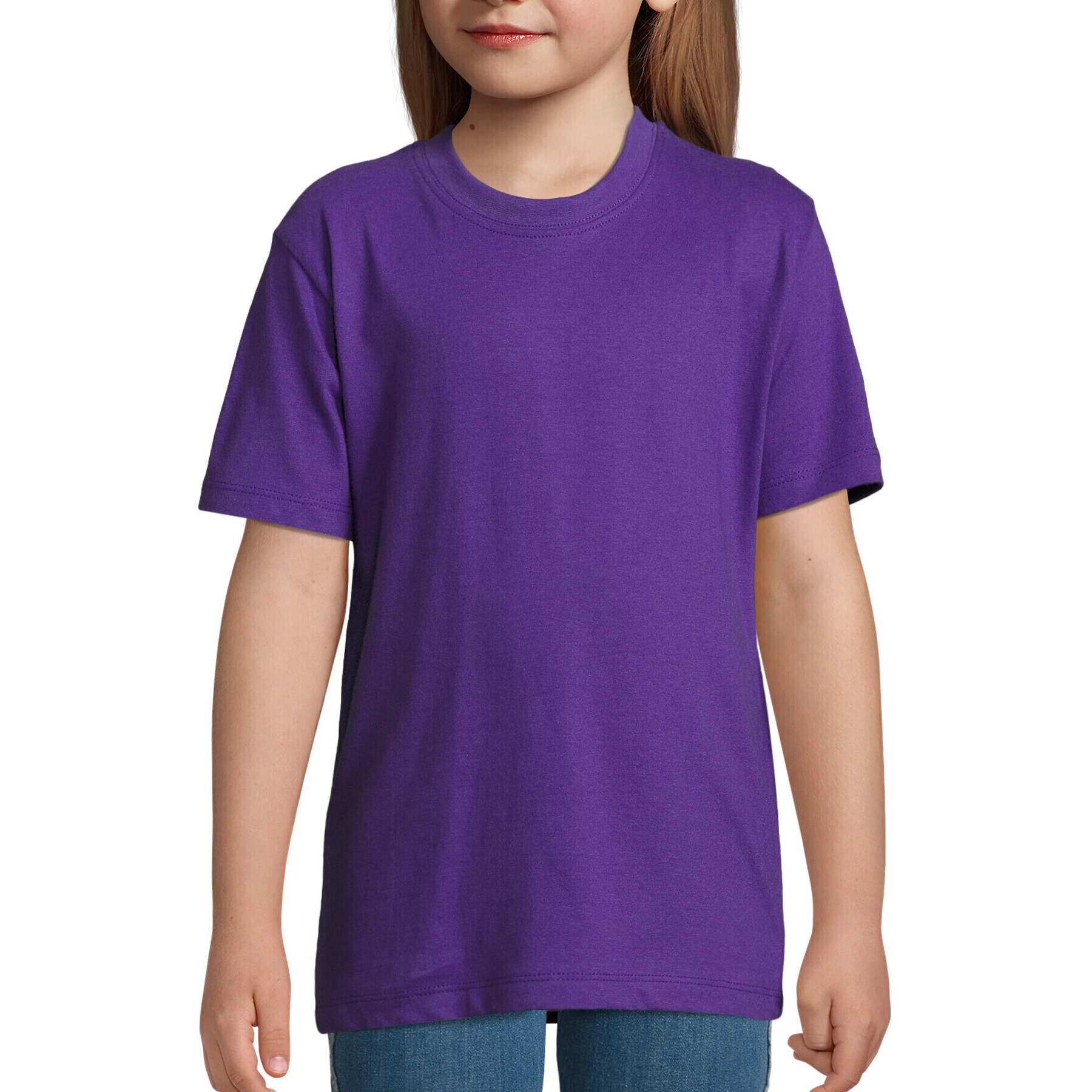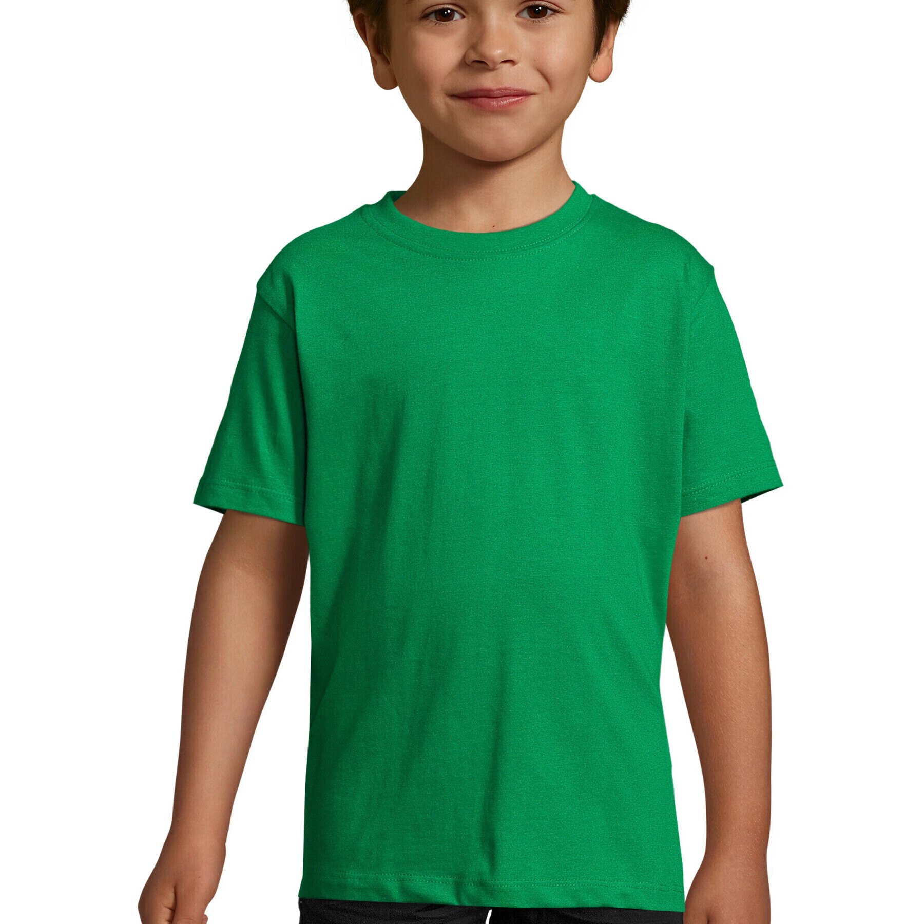 - Estilo: tapacosturas reforzado en el cuello; cuello de punto acanalado; manga corta; con costuras laterales (2-6 años) o tubular (a partir de 8 años).