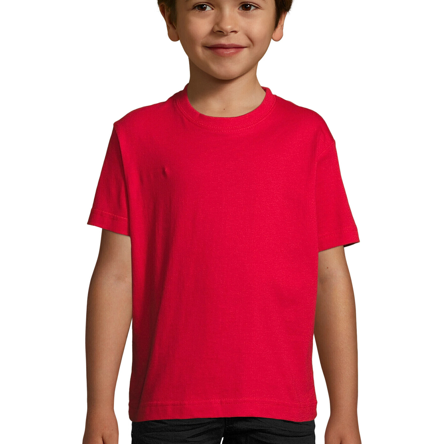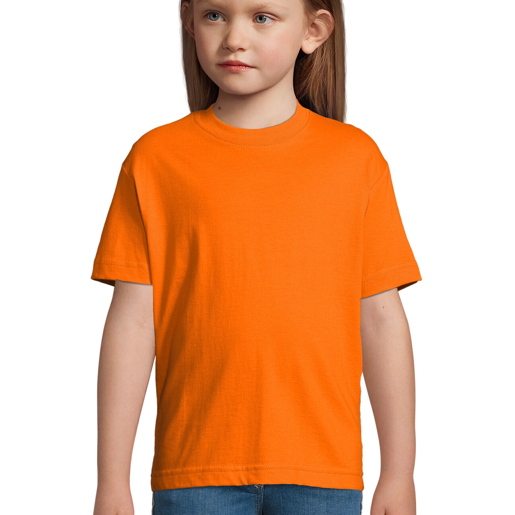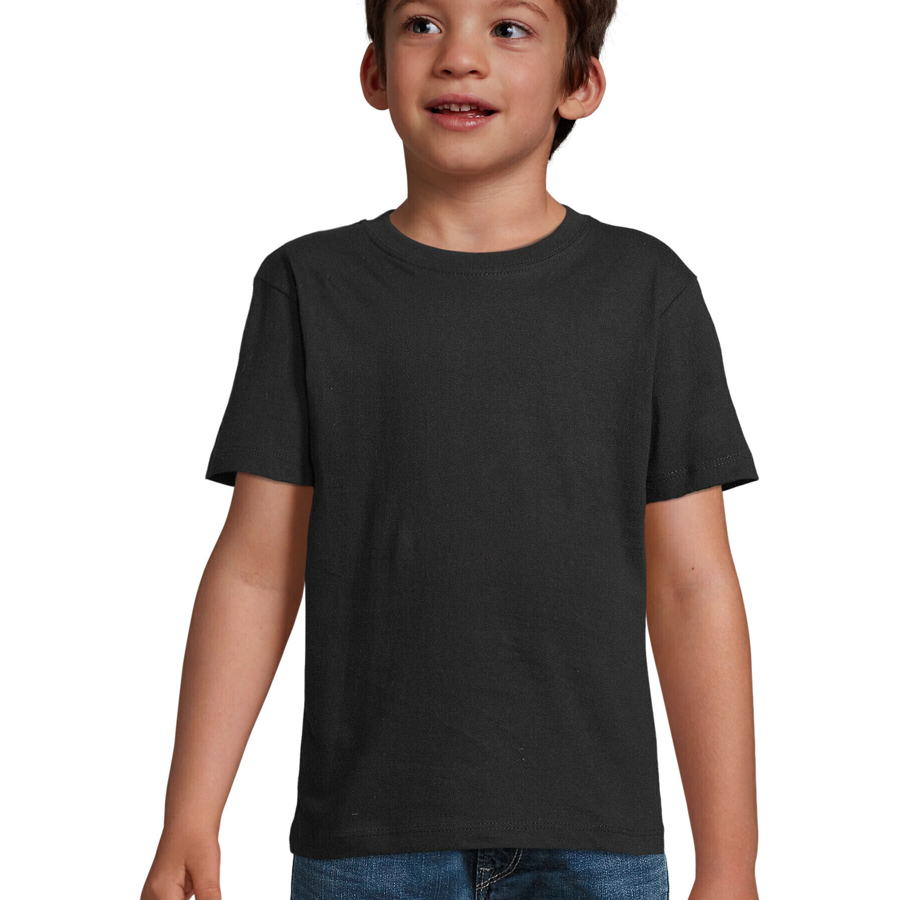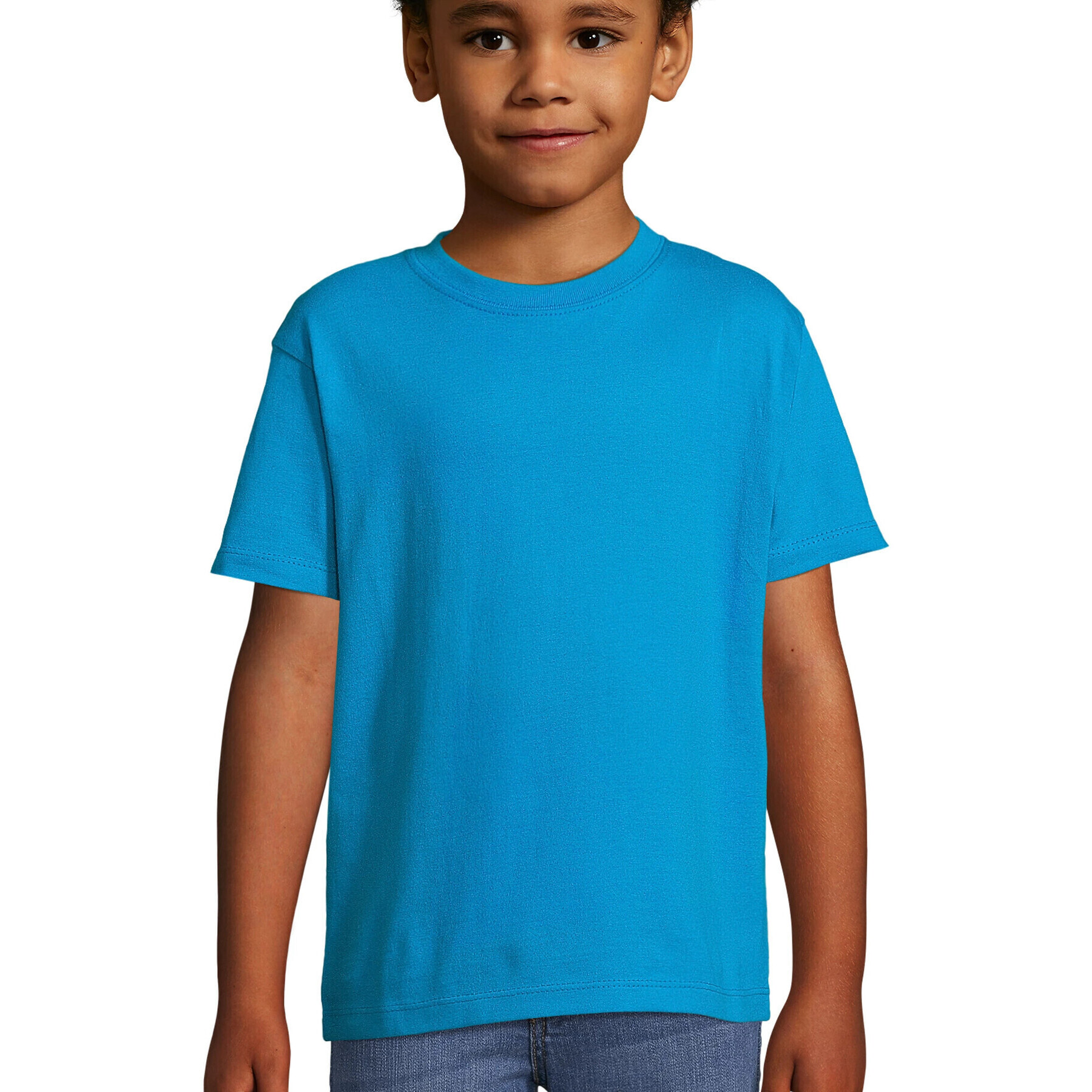 - Estilo: tapacosturas reforzado en el cuello; cuello de punto acanalado; manga corta; con costuras laterales (2-6 años) o tubular (a partir de 8 años).