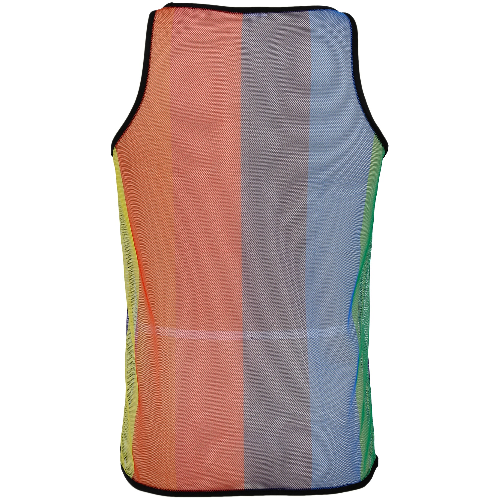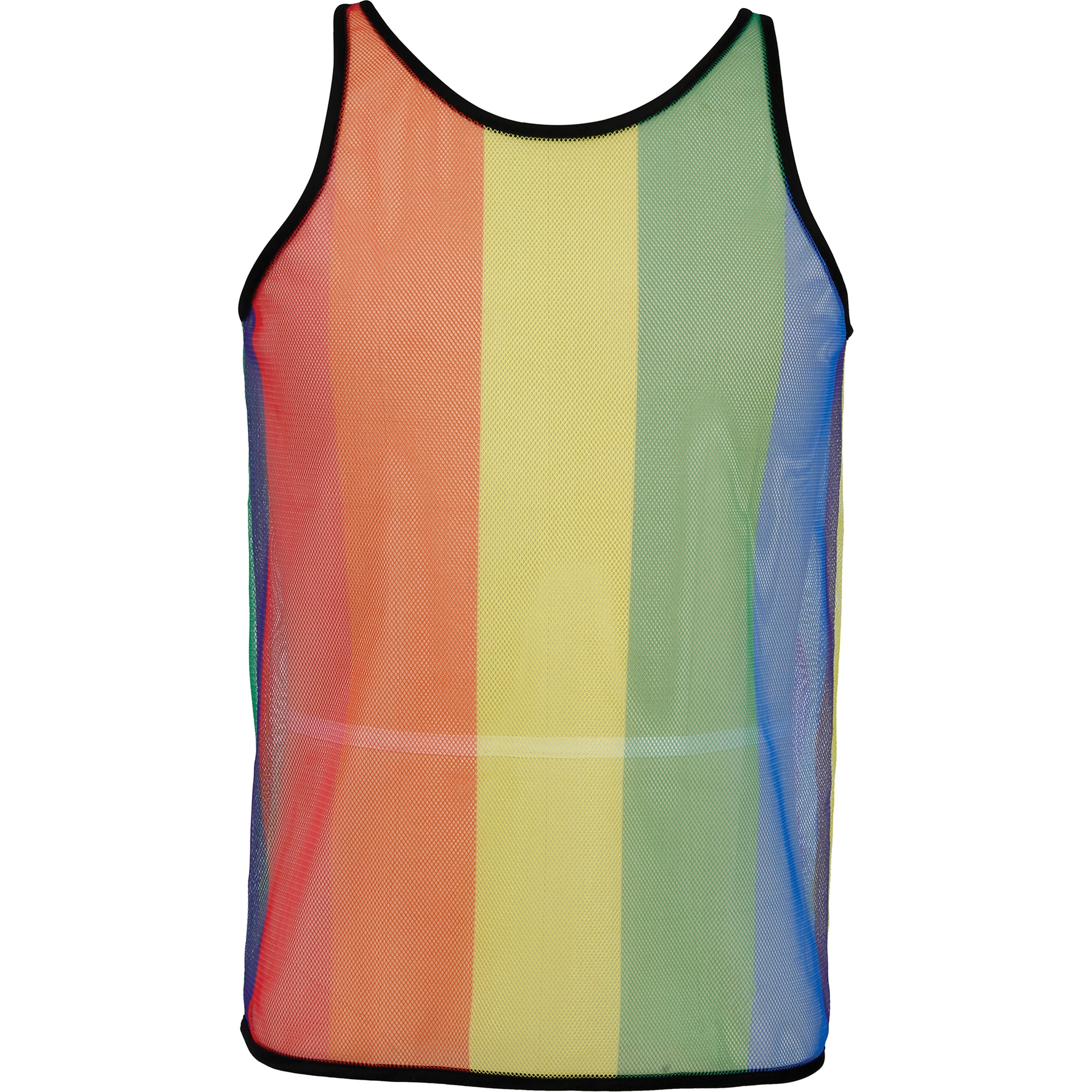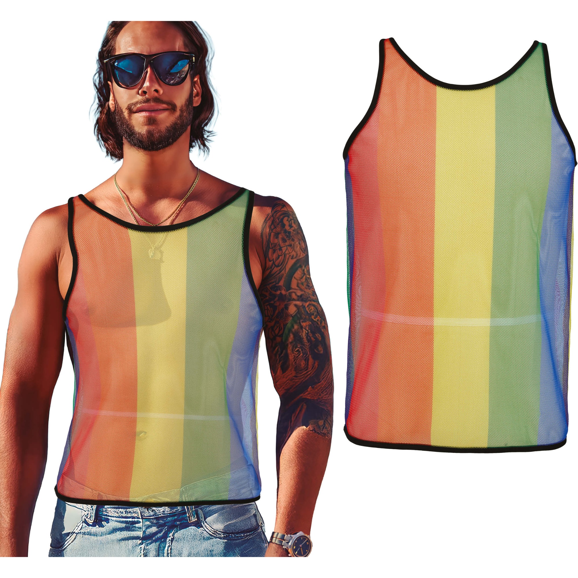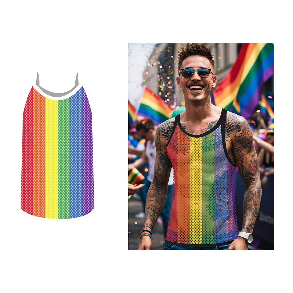 Camiseta de rejilla con franjas en colores arcoíris, pensada para destacar en celebraciones Pride y desfiles. El tejido de malla de poliéster ofrece una sensación ligera y transpirable que permite llevarla sola o como capa sobre otras prendas. Corte unisex adulto que favorece diferentes estilos y combinaciones. Diseño llamativo y colorido para crear looks festivos y originales.