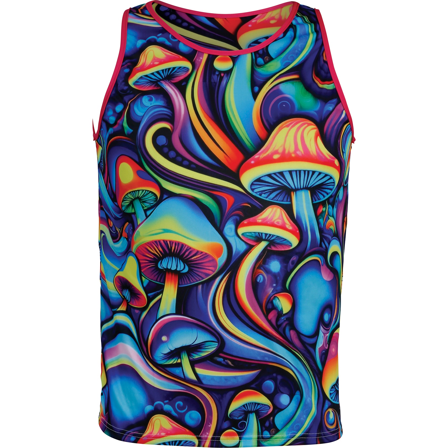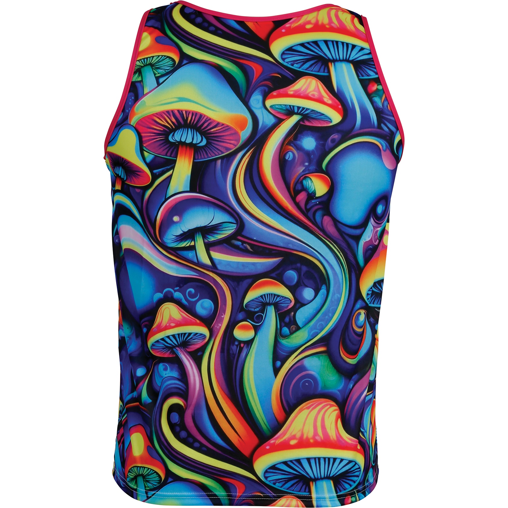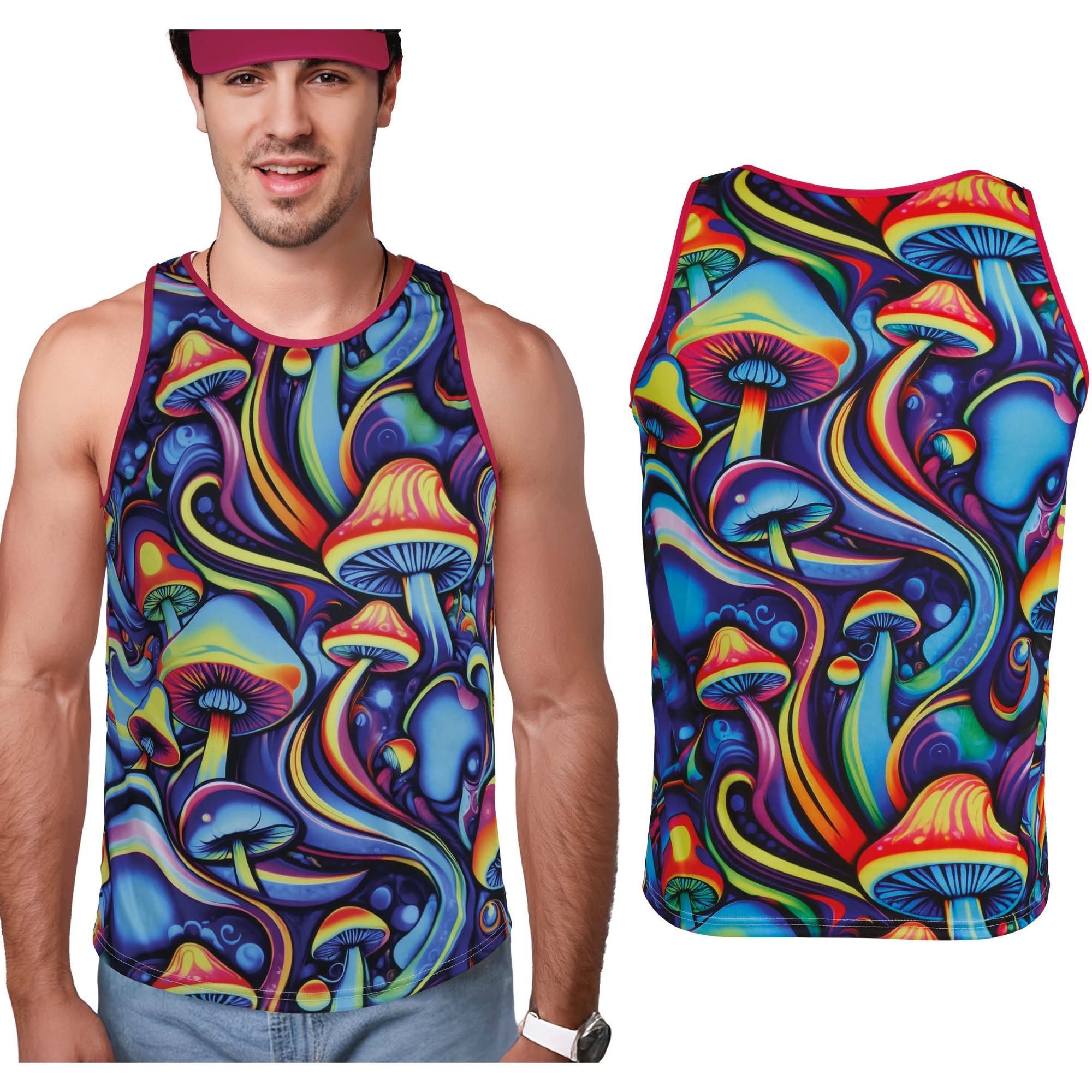 Impactante camiseta de tirantes con un estampado psicodélico de setas en colores neón que captura todas las miradas.