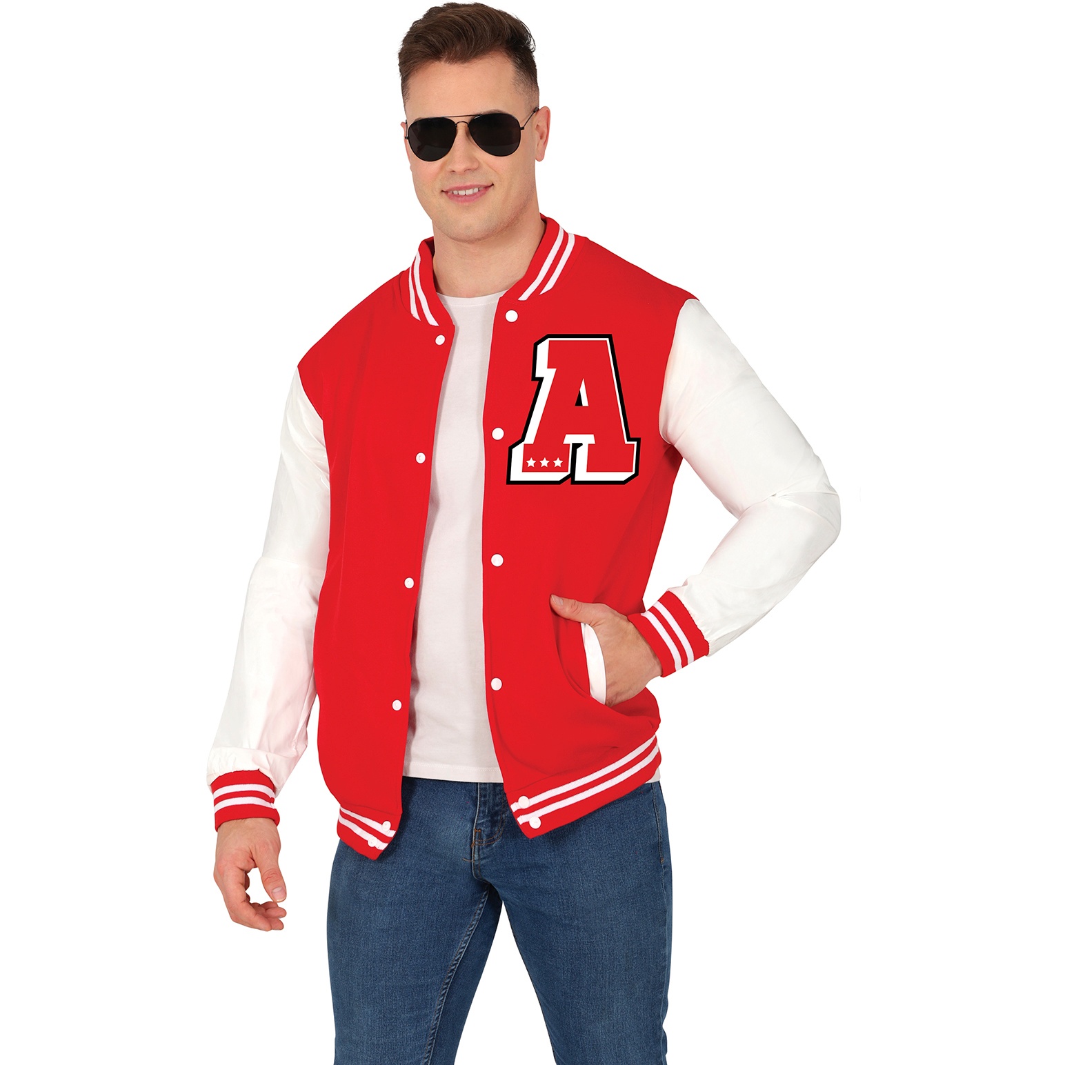 - Estilo varsity college llamativo en rojo con contrastes blancos para un look auténtico.