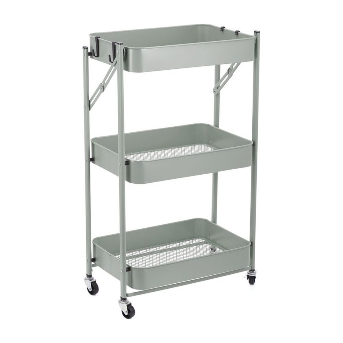 Carro auxiliar de tres niveles con diseño plegable que maximiza el espacio en cualquier estancia. Versátil y práctico, perfecto para organizar cocina, baño, oficina o rincón de manualidades. Bandejas profundas y ruedas giratorias que facilitan su traslado sin esfuerzo. Acabado en verde moderno que combina con diferentes estilos de decoración.