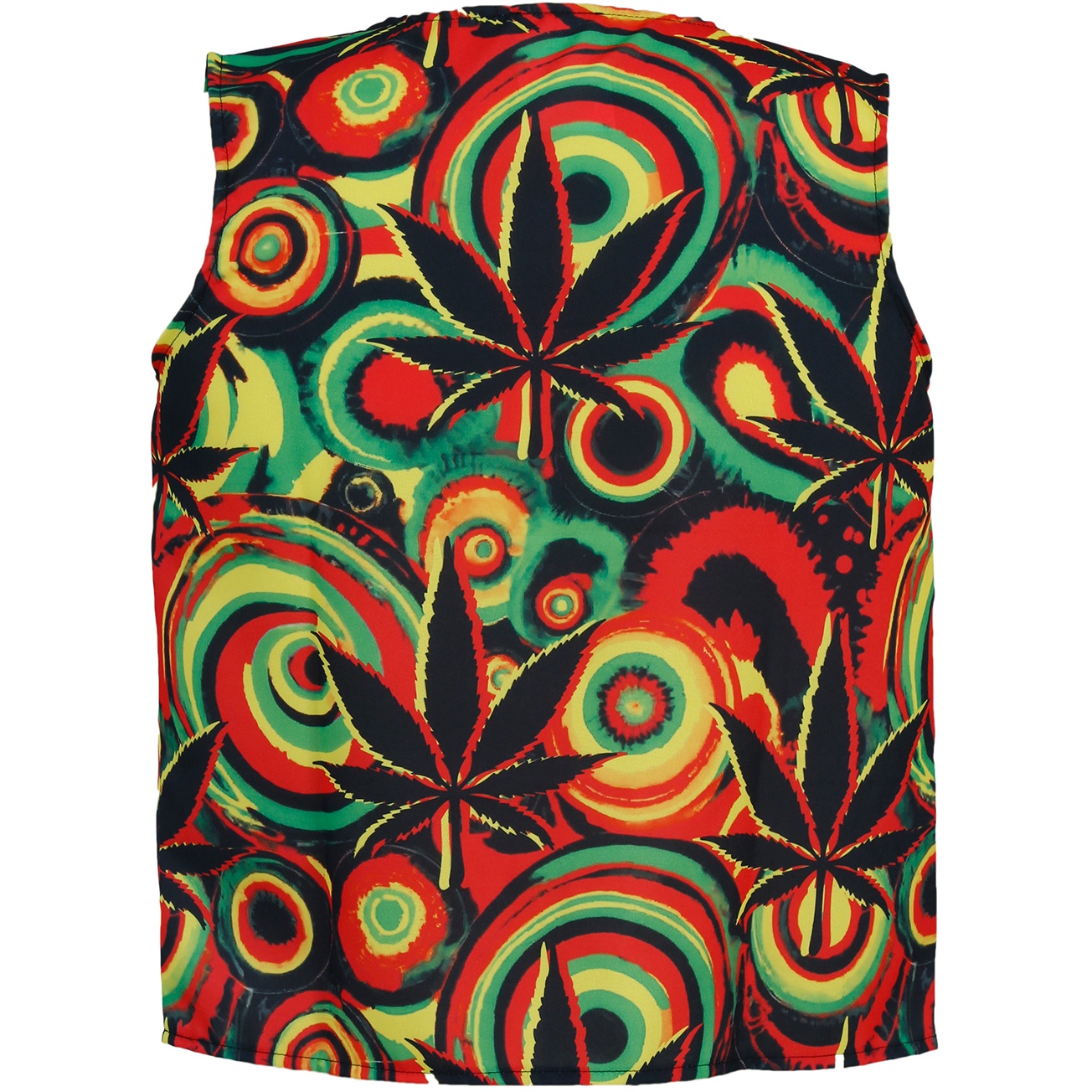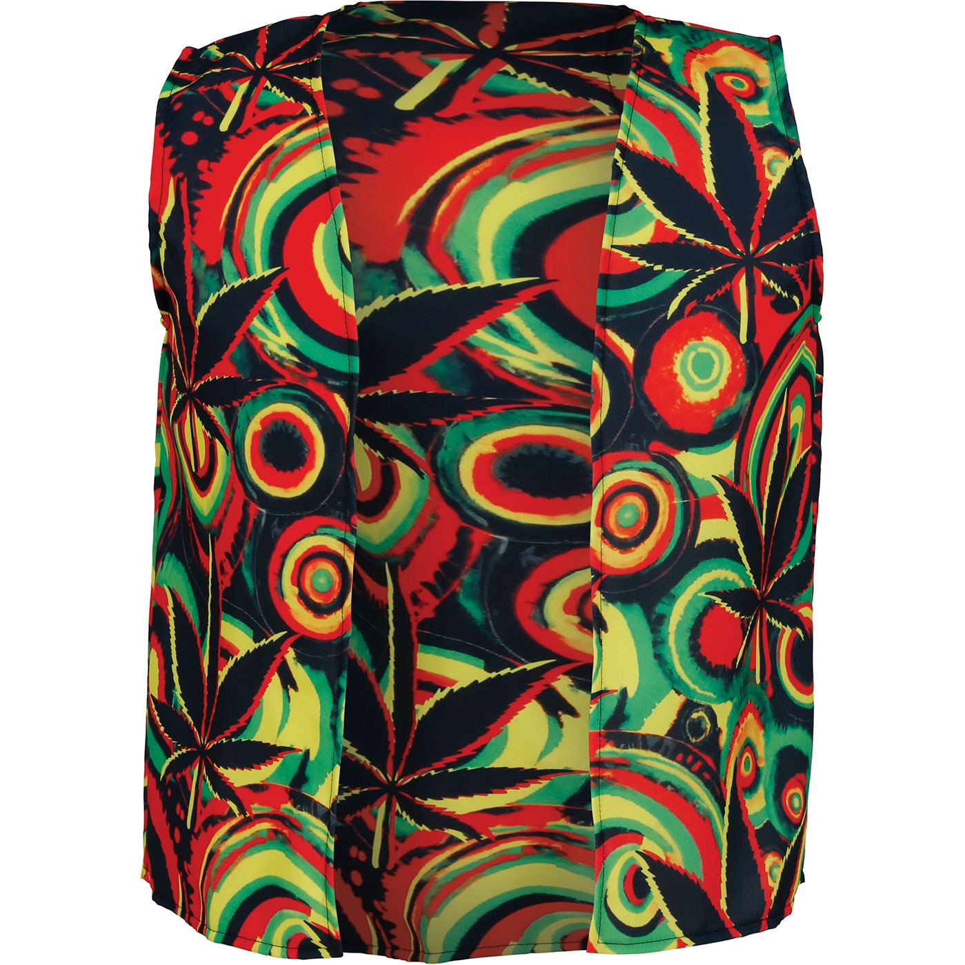 Chaleco Jamaica con estampado vibrante y colores intensos que llaman la atención. Presenta un corte abierto sin mangas que facilita su colocación y permite combinarlo sobre cualquier prenda. Confeccionado en poliéster ligero que ofrece confort y caída fluida para disfrutar de la fiesta con estilo. Perfecto como complemento llamativo para carnaval y celebraciones temáticas.