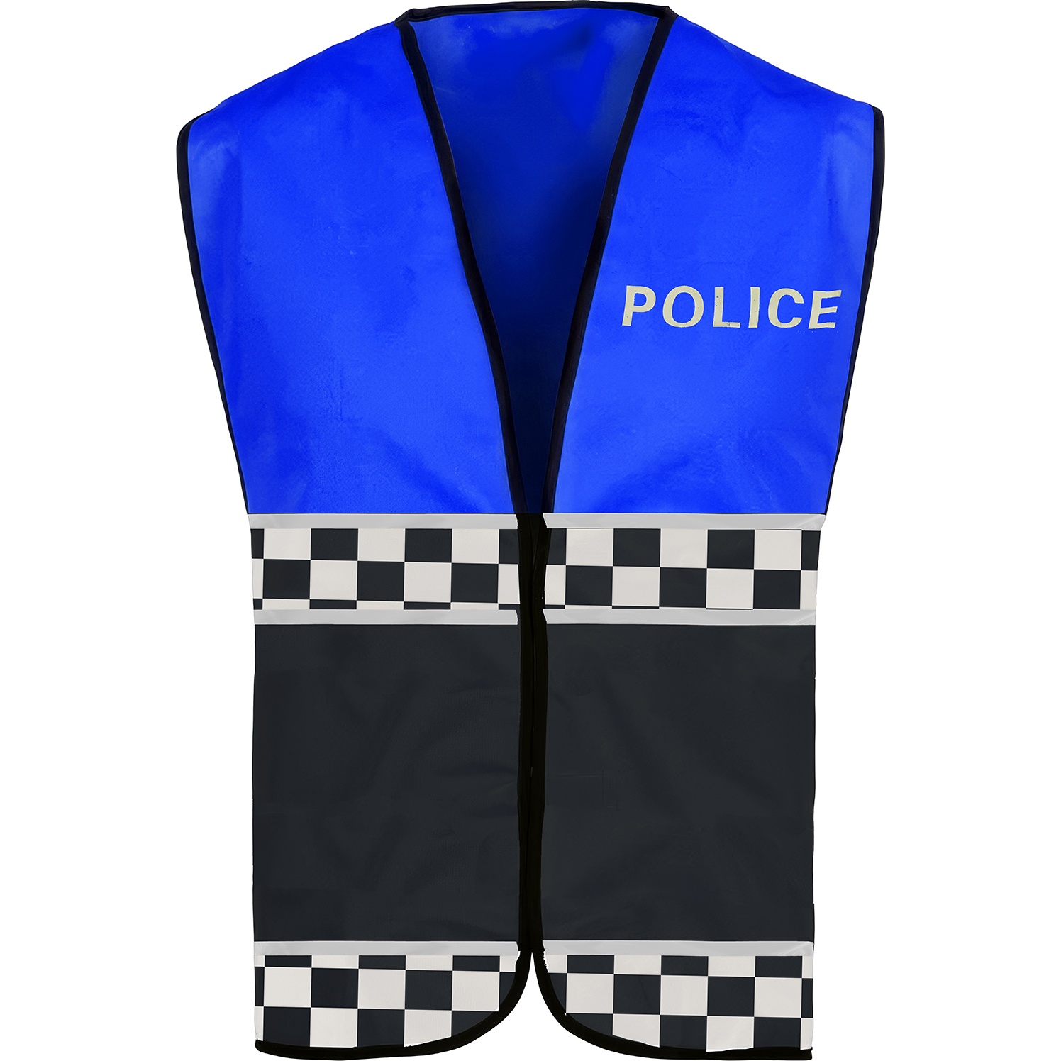 Chaleco policial azul de corte adulto con detalles visibles que recrean el estilo de un uniforme realista. Presenta bandas ajedrezadas y el texto "POLICE" en el pecho para un acabado reconocible y llamativo. Confeccionado en poliéster ligero para un uso cómodo y fácil de llevar. Abertura frontal que facilita colocarlo y quitarlo rápidamente.
