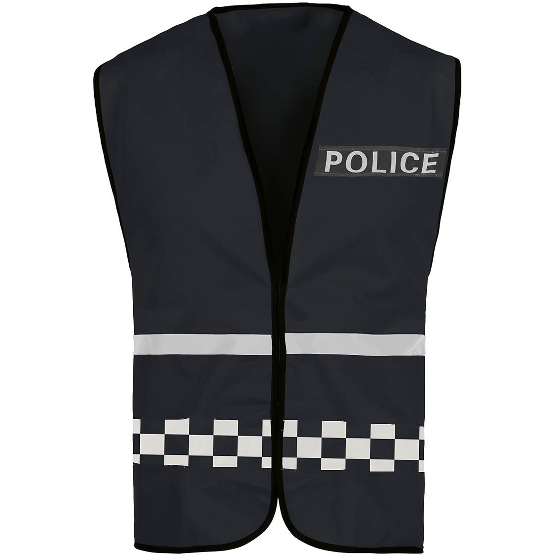 Chaleco de policía negro para adulto con estampado "POLICE" y bandas reflectantes que aportan un acabado realista. Fabricado en poliéster ligero, ofrece comodidad y buena presencia para complementar cualquier look policial. Diseño sin mangas con apertura frontal para colocarlo fácilmente sobre la ropa. Perfecto para fiestas, carnavales y eventos temáticos donde quieras un accesorio auténtico y fácil de usar.