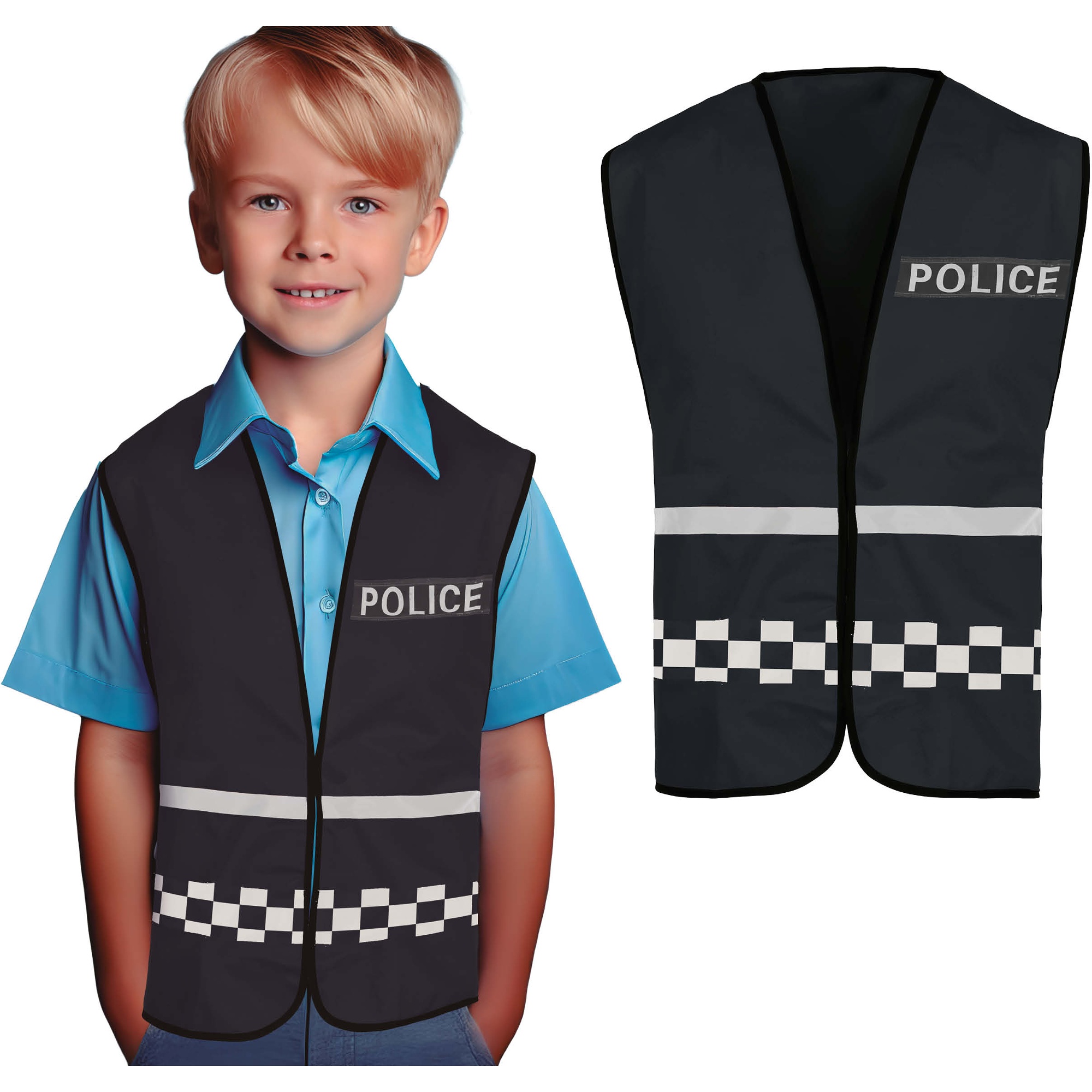 Chaleco de policía negro pensado para disfraces y juego de roles infantiles. Presenta un diseño realista con la serigrafía "POLICE" y bandas a cuadros reflectantes que aportan estilo y visibilidad. Confeccionado en poliéster ligero y resistente, ofrece un corte cómodo que permite libertad de movimiento durante el juego. Su apertura frontal facilita ponérselo y quitárselo rápidamente. Ideal para completar atuendos de policía y estimular el juego imaginativo.