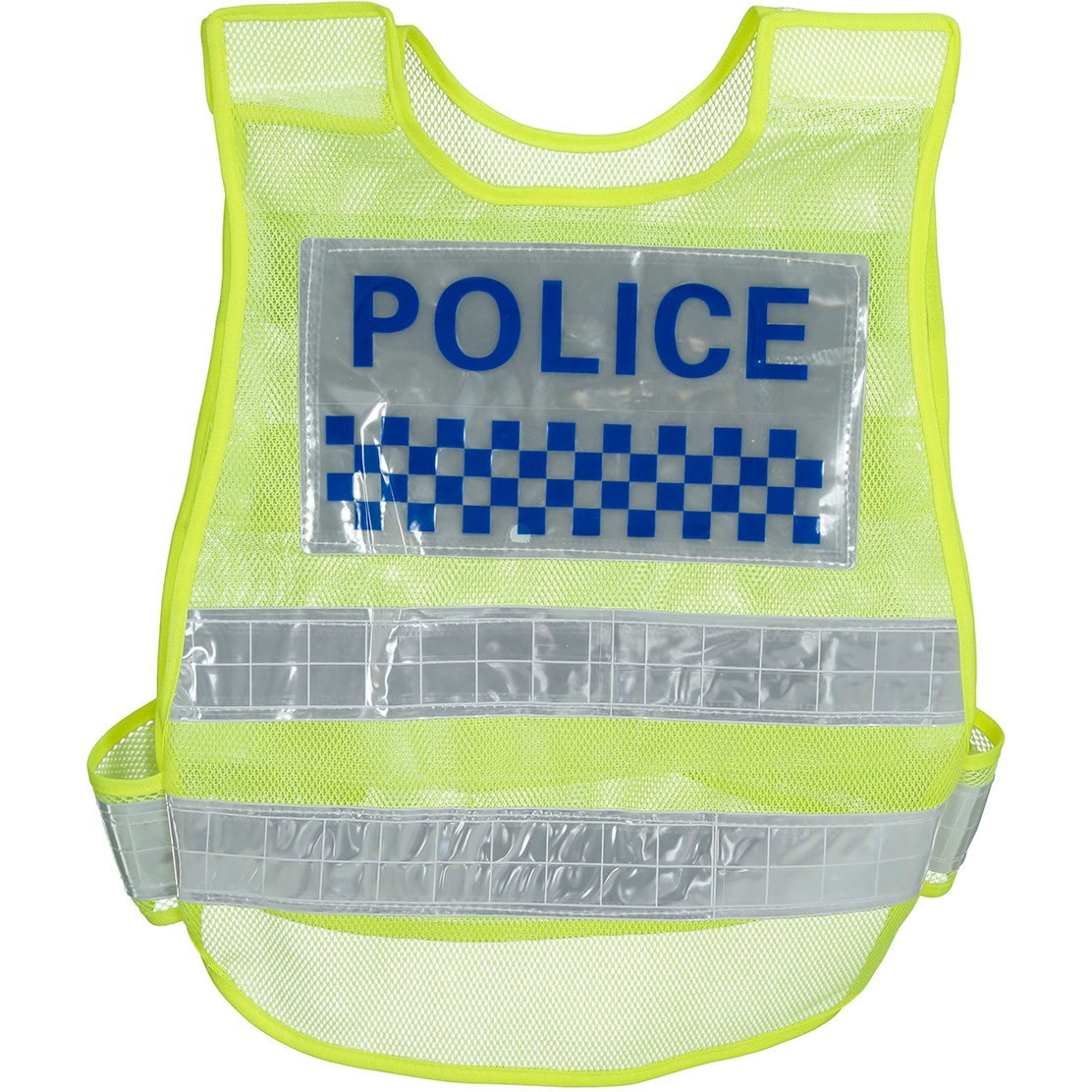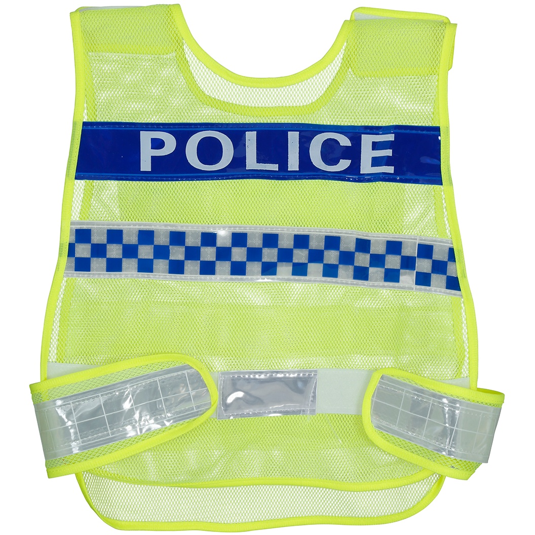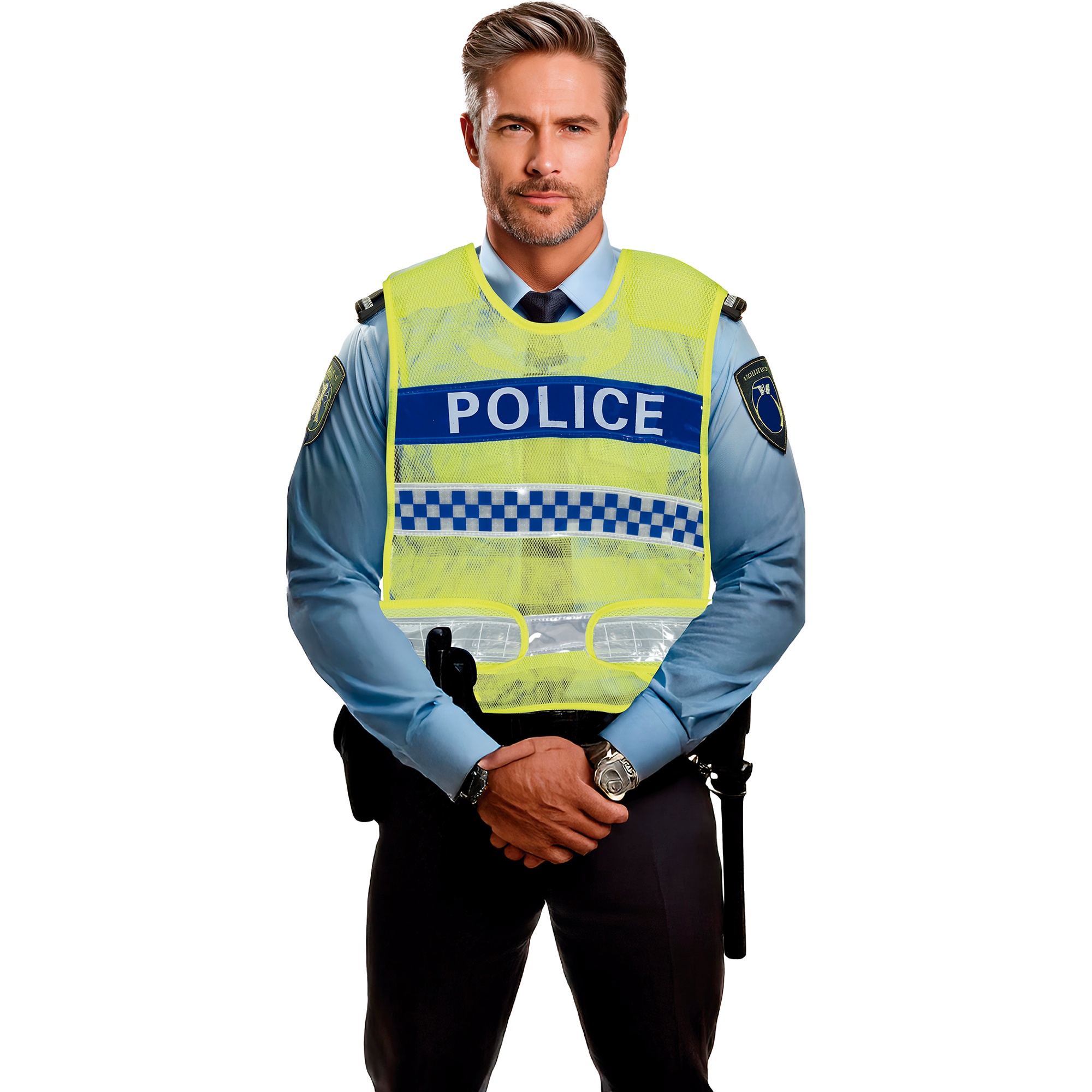 Chaleco de policía de tráfico en color amarillo pensado para adultos. Perfecto para carnaval, fiestas y eventos temáticos donde buscas un complemento llamativo y reconocible. Presenta la inscripción "POLICE", franjas ajedrezadas y bandas reflectantes para un aspecto realista. Diseño ligero y fácil de poner, ideal como complemento de disfraz o para animación en eventos.