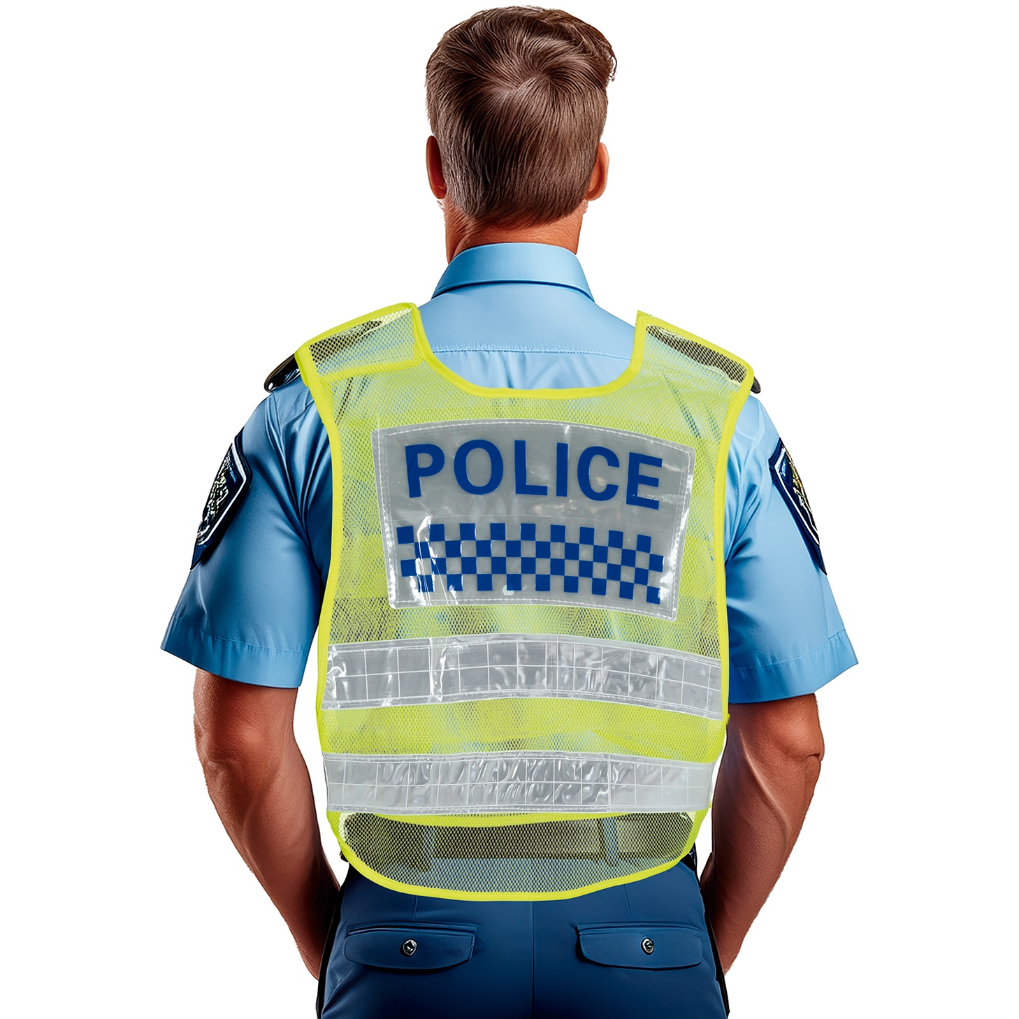 - Aspecto realista con la inscripción 'POLICE' y franjas ajedrezadas que imitan chalecos oficiales.