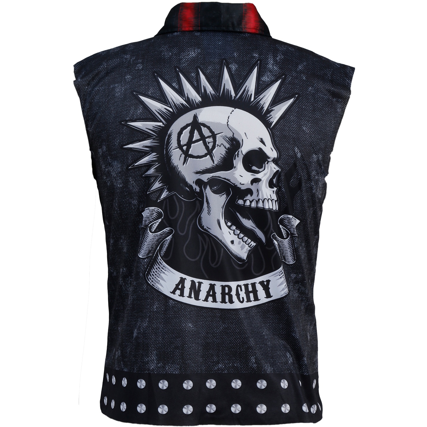 Chaleco sin mangas con estética punk y efecto desgastado que completa cualquier look rock. Fabricado en poliéster, aporta ligereza y resistencia para usarlo sobre camisetas o como complemento de disfraz. Presenta cierre frontal con cremallera y estampados de temática anarquía: "PUNK is not dead", "ANARCHY", "NO FUTURE" y bandera británica con bulldog. Diseño adulto y cómodo, pensado para aportar un toque rebelde y auténtico a tu outfit.