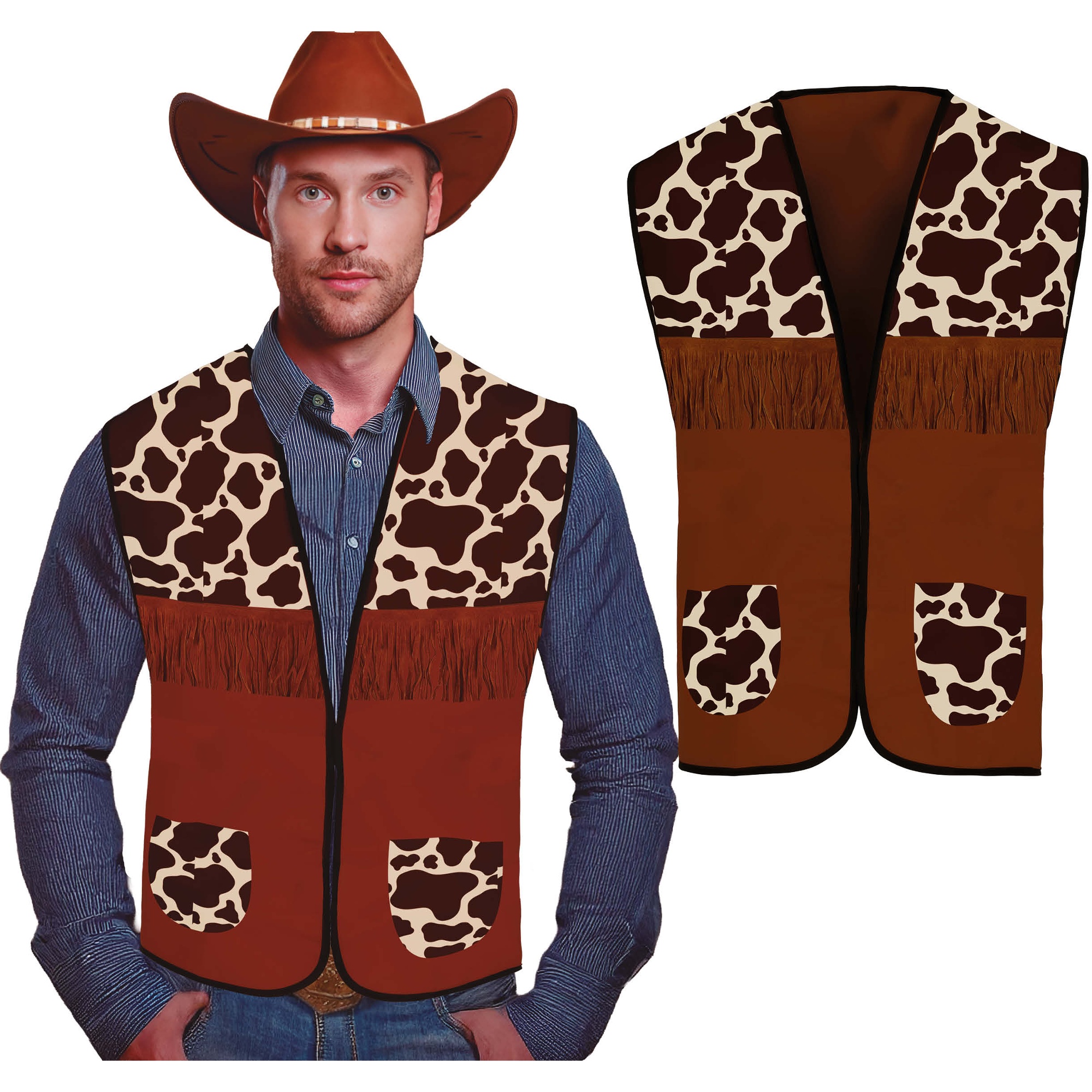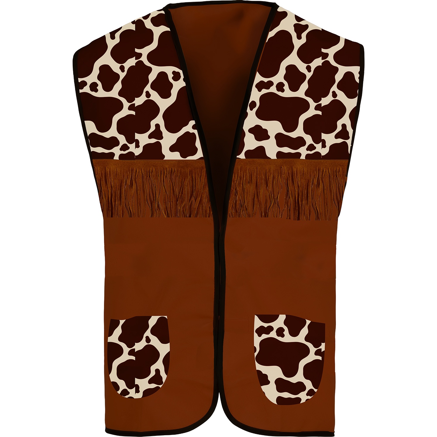 Chaleco vaquero estilo cowboy para adulto con detalles que evocan el clásico look del oeste. Presenta un estampado tipo vaca en hombros y bolsillos, y una franja de flecos decorativos en el pecho que aportan carácter al conjunto. Diseñado en poliéster ligero para un uso cómodo como complemento de disfraz. Corte abierto y acabado con ribete oscuro que realza el contraste del diseño.