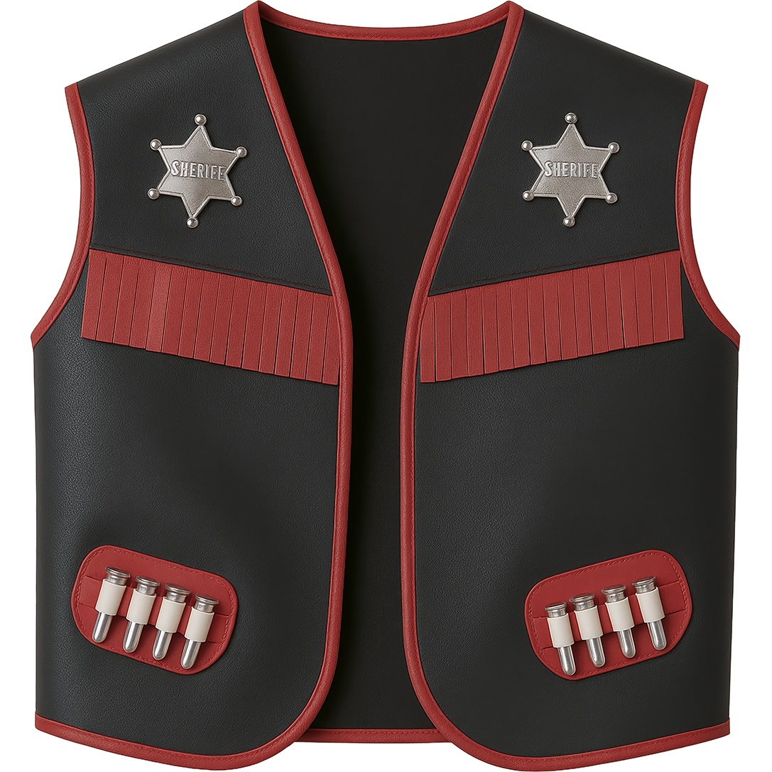 Chaleco vaquero infantil pensado como complemento para disfraces y juegos de imitación. Presenta un acabado en simil cuero con flecos y ribetes en contraste que recrean el estilo del lejano Oeste. Incluye detalles decorativos estilo sheriff y pequeñas cartucheras que realzan el look vaquero. Corte cómodo y abierto, fácil de poner para los más pequeños; ideal para Carnaval, fiestas temáticas y actividades escolares.