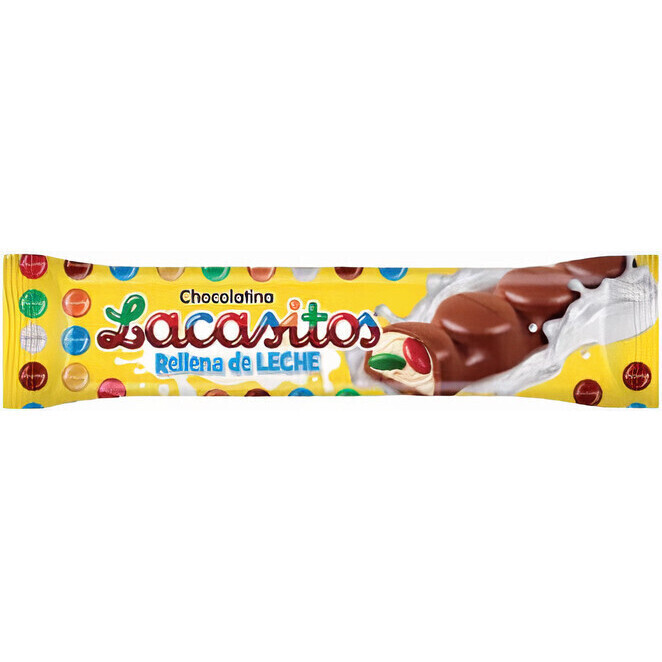 - Chocolate con leche (50%) relleno de crema de leche (38%) con grageas de chocolate con leche recubiertas de azúcar coloreado (12%).