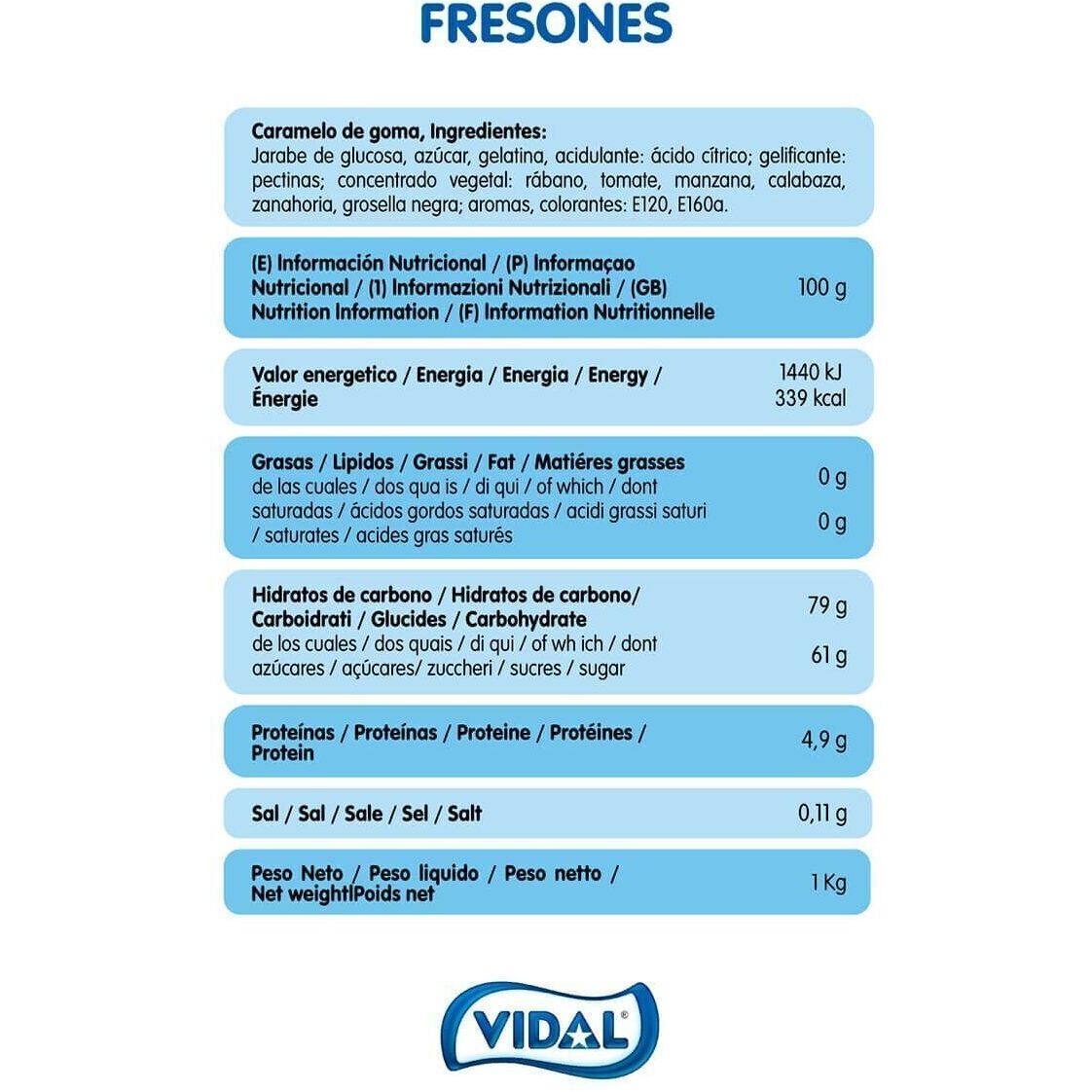 Ingredientes: jarabe de glucosa, azúcar, gelatina, acidulante: ácido cítrico; gelificante: pectinas; concentrado vegetal: rábano, tomate, manzana, calabaza, zanahoria, grosella negra; aromas, colorantes: E120, E160a.