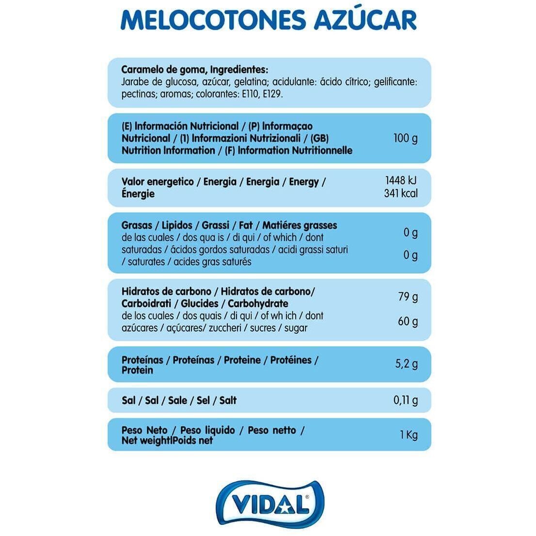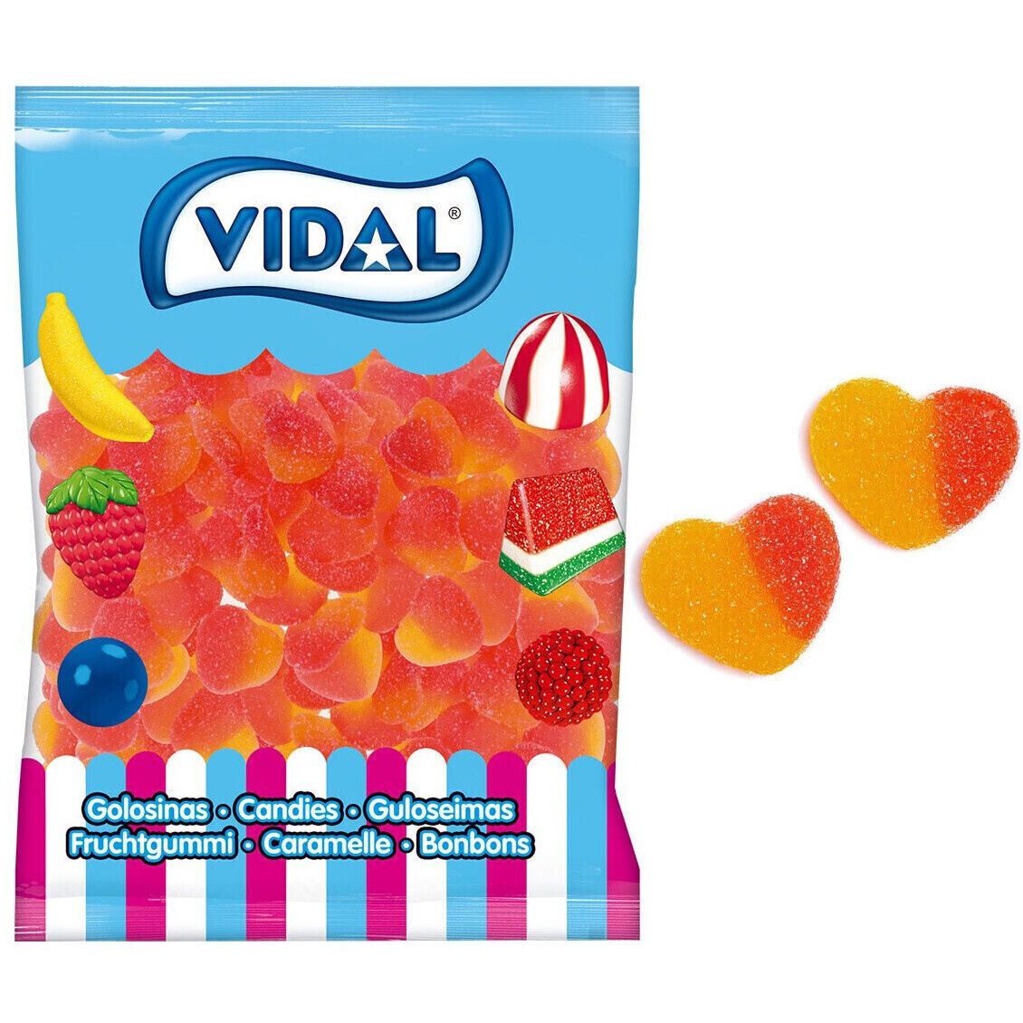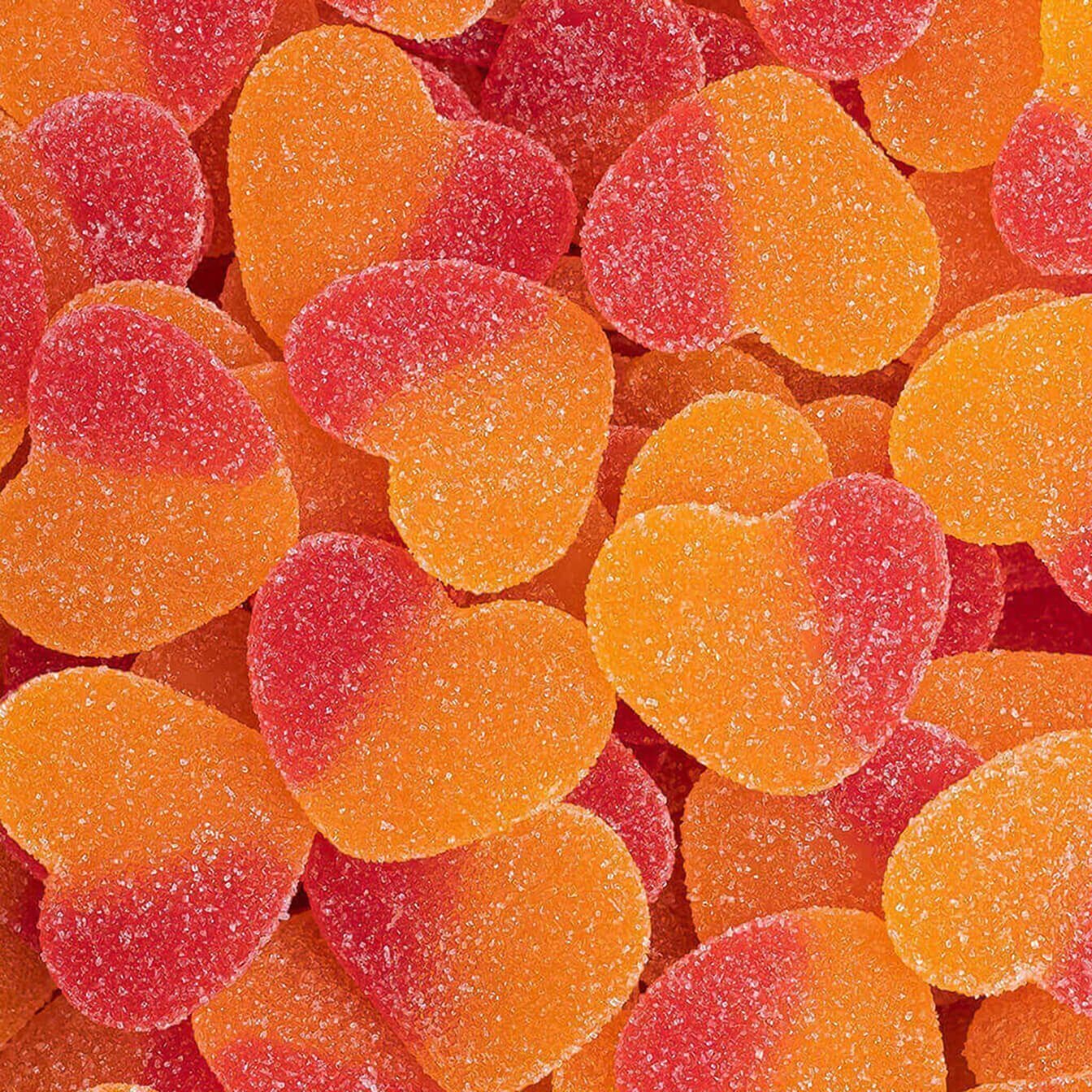 - Chuches con forma de corazón bicolor con un dulce sabor a melocotón y una fina cobertura de azúcar.