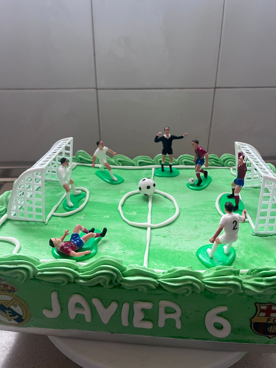 Este producto se compone de 4 figuras de futbolistas con camisetas y pantalones blancos y azulgranas, 1 árbitro con uniforme negro y 2 porterías. Cada figura incorpora una peana de color verde que facilita su colocación sobre el pastel.