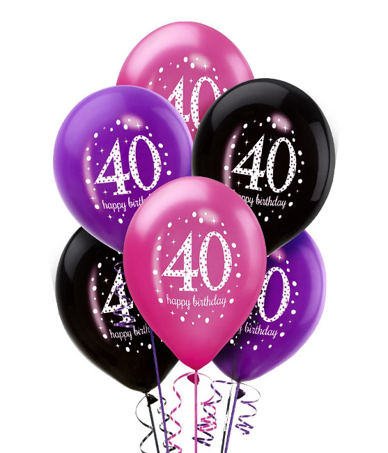 Paquete con surtido de globos de látex en color negro, morado y fucsia, con impresión del número en blanco. Perfectos para decorar el espacio de tu fiesta de cumpleaños.