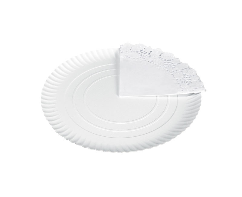 Producto para decorar la mesa en forma de bandeja redonda realizada en cartón con blonda de papel.