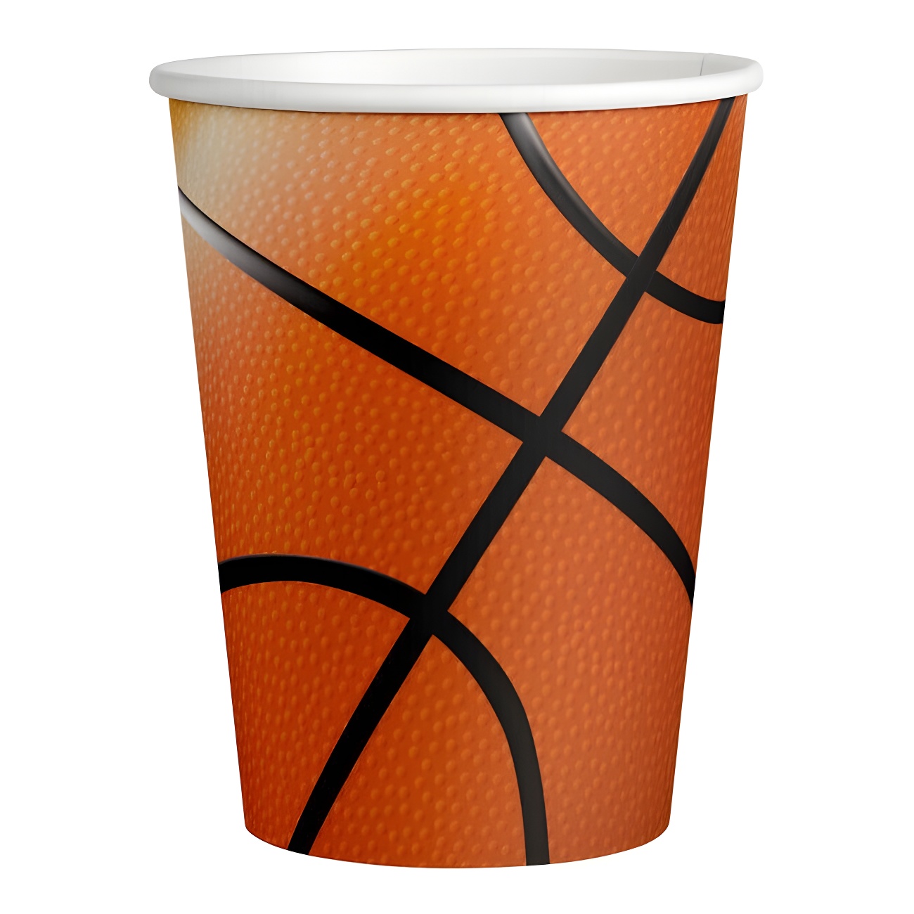 Vasos de cartón laminado en paquete de 8 unidades. Sobre un fondo marrón clarito podemos ver el dibujo de una pelota de baloncesto.