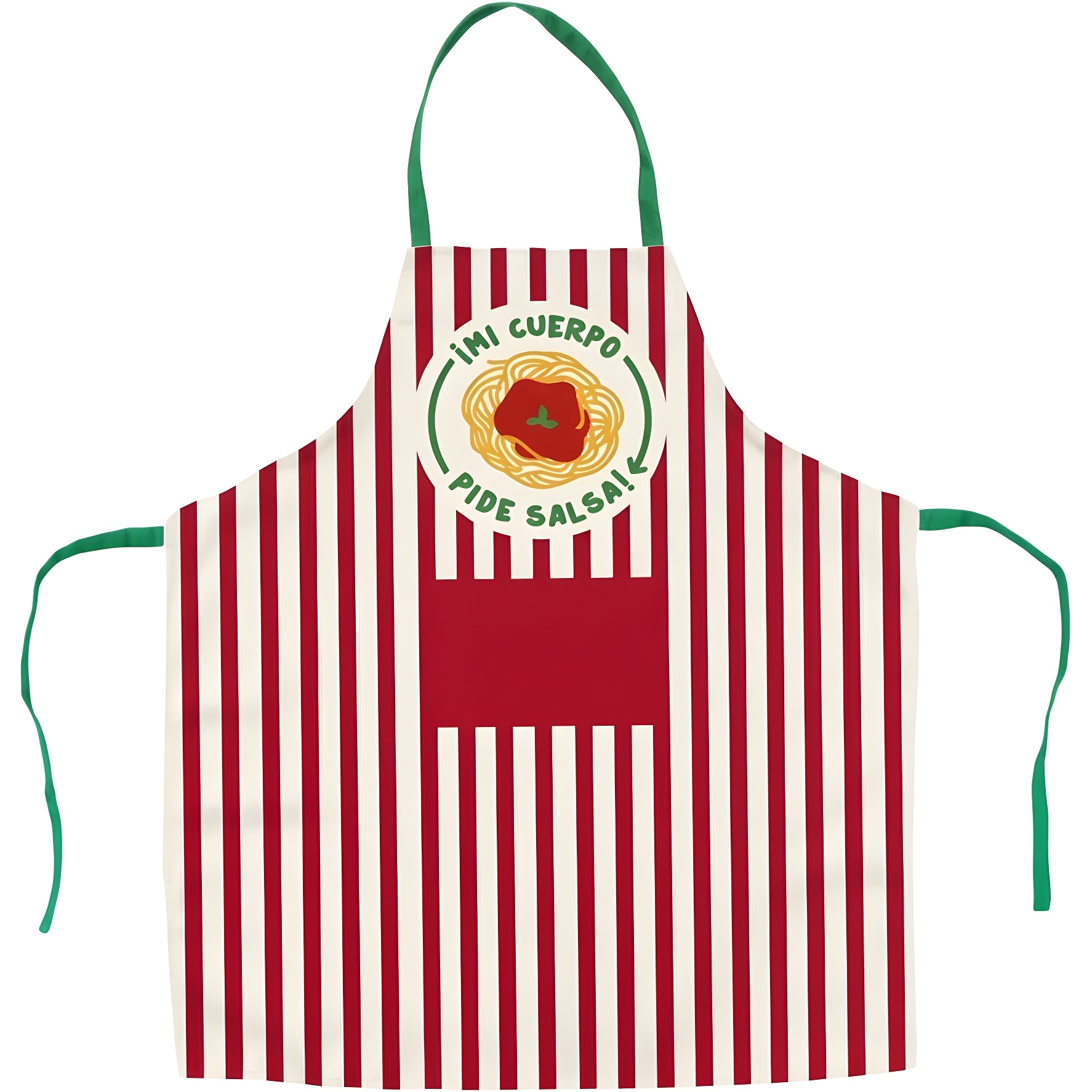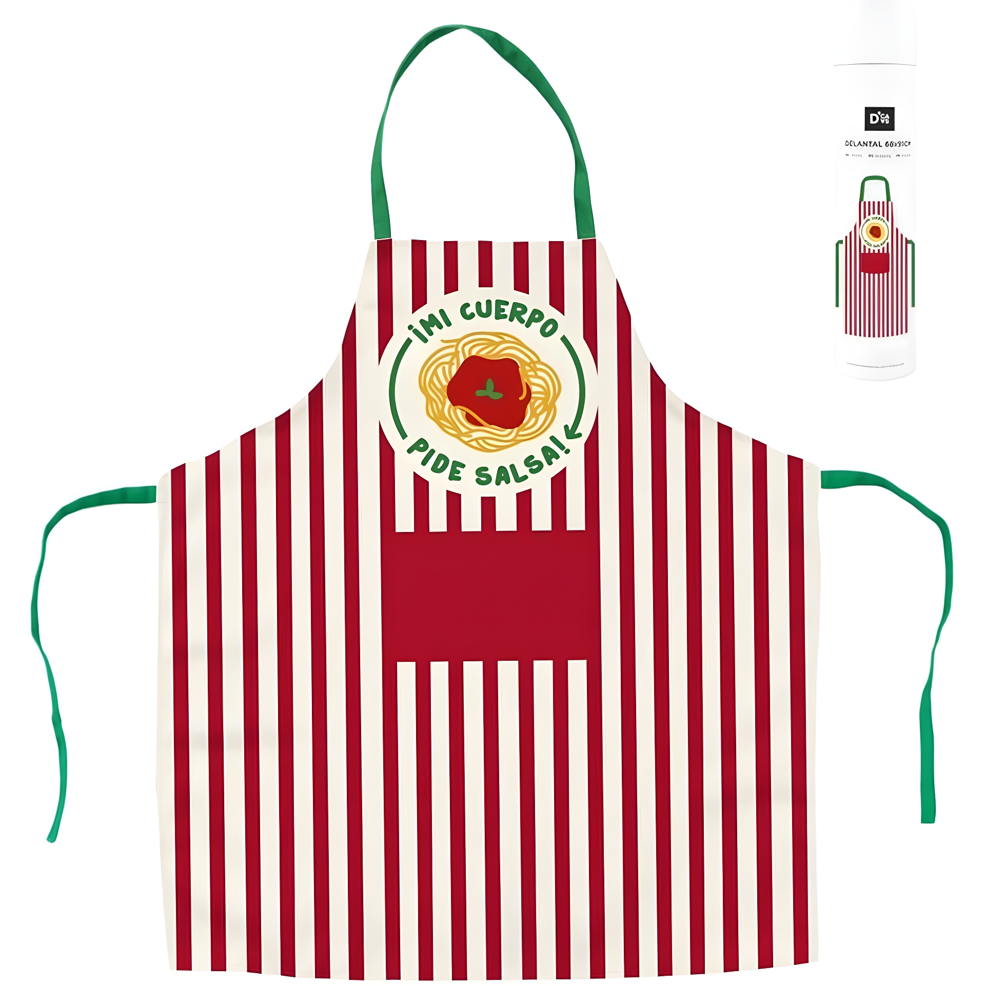 Delantal infantil con divertido estampado "¡Mi cuerpo pide salsa!" pensado para pequeños chefs de 4 a 8 años. Su diseño a rayas y el detalle de pasta aportan un toque alegre y original a la hora de cocinar o crear manualidades.